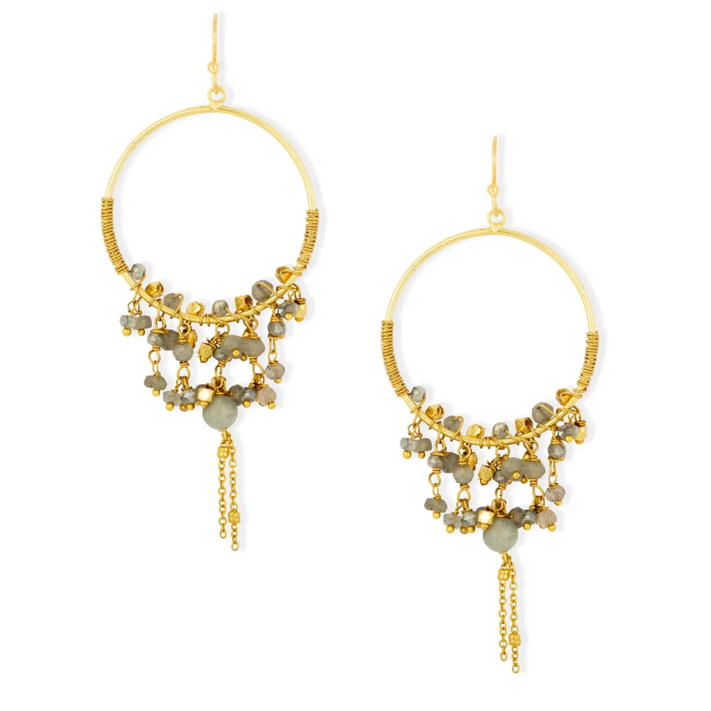 These hoop earrings with labradorite beads are exquisitely handcrafted. They feature genuine labradorite stones elegantly suspended along a refined circular frame. Delicate gold chain tassels cascade gracefully around the hoop, creating a sophisticated movement that catches the light beautifully. These statement pieces effortlessly transition from day to evening, adding a touch of artisanal luxury to any ensemble.