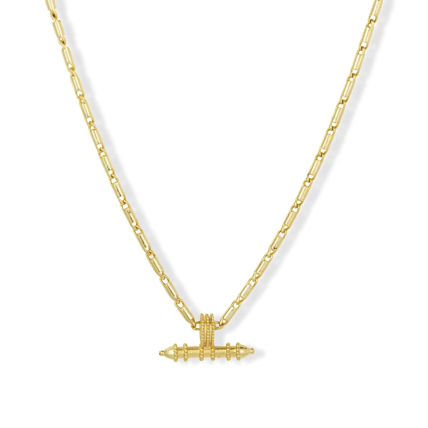 The Jaya Gold Necklace exudes effortless, contemporary style with its minimalist T-bar charm pendant. Crafted from quality gold plated brass, this delicate necklace instantly elevates any look. Wear it solo for an understated vibe or layer with other necklaces for an on-trend, statement look. The styling possibilities are endless with this must-have pendant necklace.