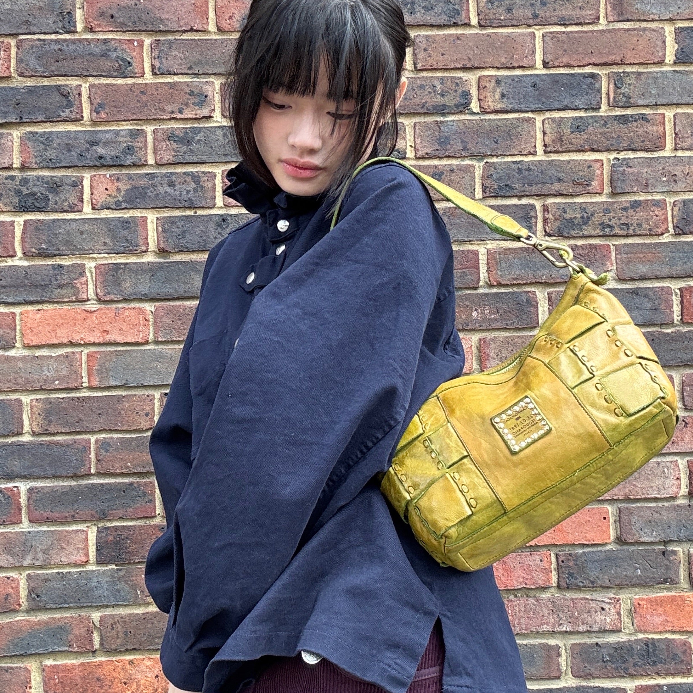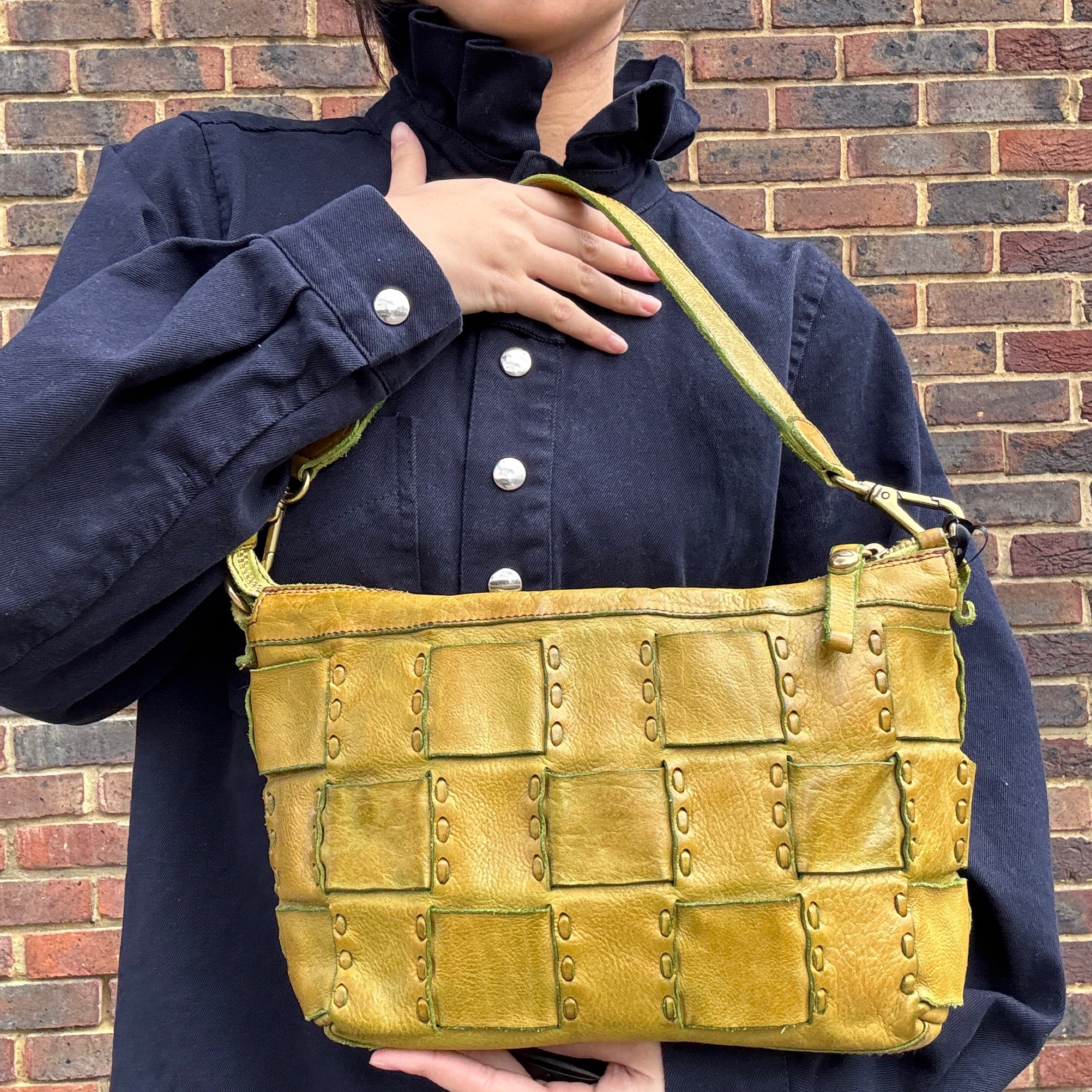 The Edera is a handmade leather crossbody bag, in a distinctive citron shade with weaving and stitching details.