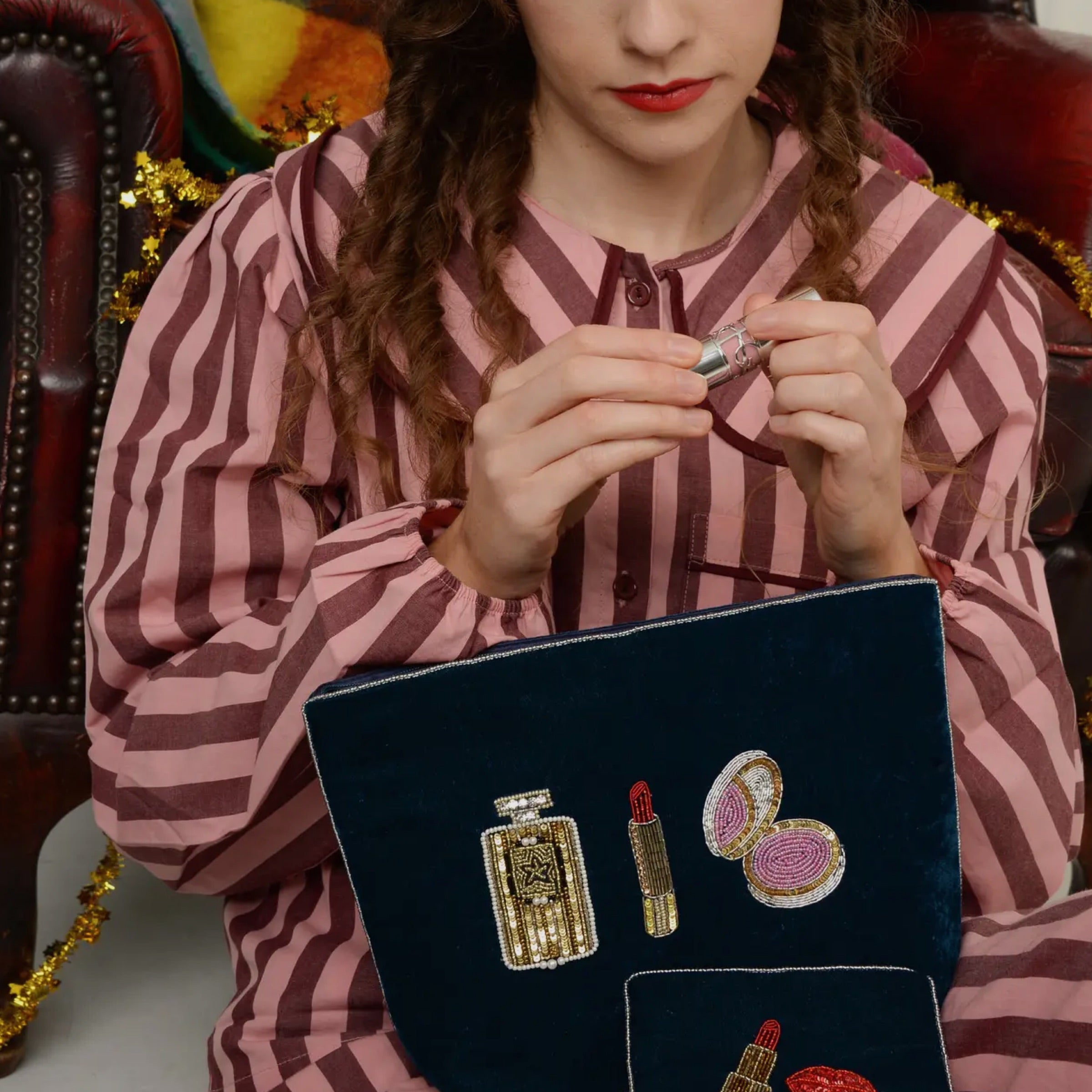 This beautiful pouch decorated with a hand-beaded perfume, lipstick and compact mirror motif features intricate beading on a luxurious velvet base. pouch features a water-resistant lining making it a great choice for a beauty bag.