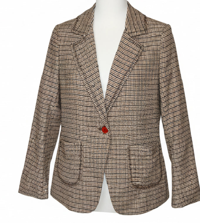 The clever addition of one red button closure gives this houndstooth jacket a fashion forward look for 2026. Sharply tailored, featuring a collar, long sleeves and two pockets, thejacket is fully lined.