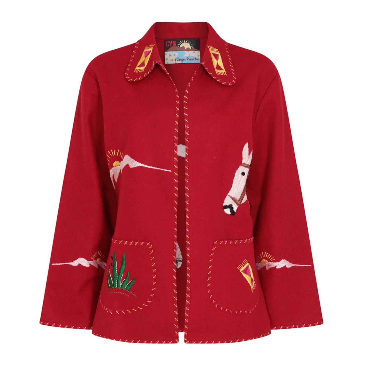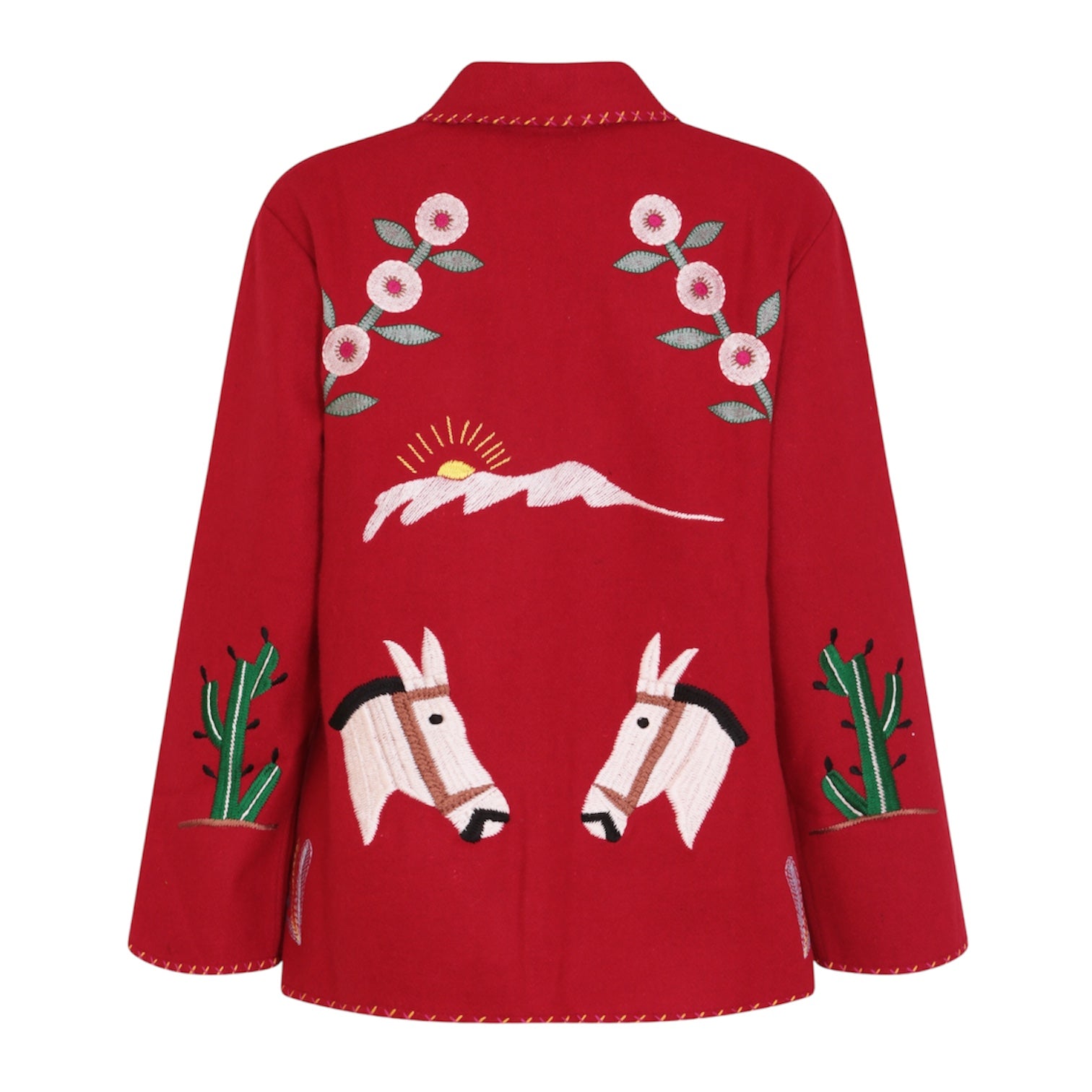 Exquisite wool jacket featuring embroidered motifs throughout and finished with blanket stitching to the hem and pocket. The jacket features two patch pockets to the front left and right, is designed for an easy fit and is unlined.