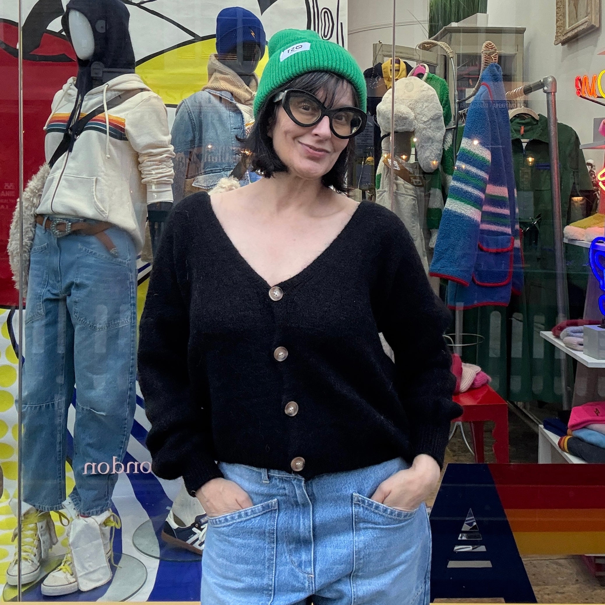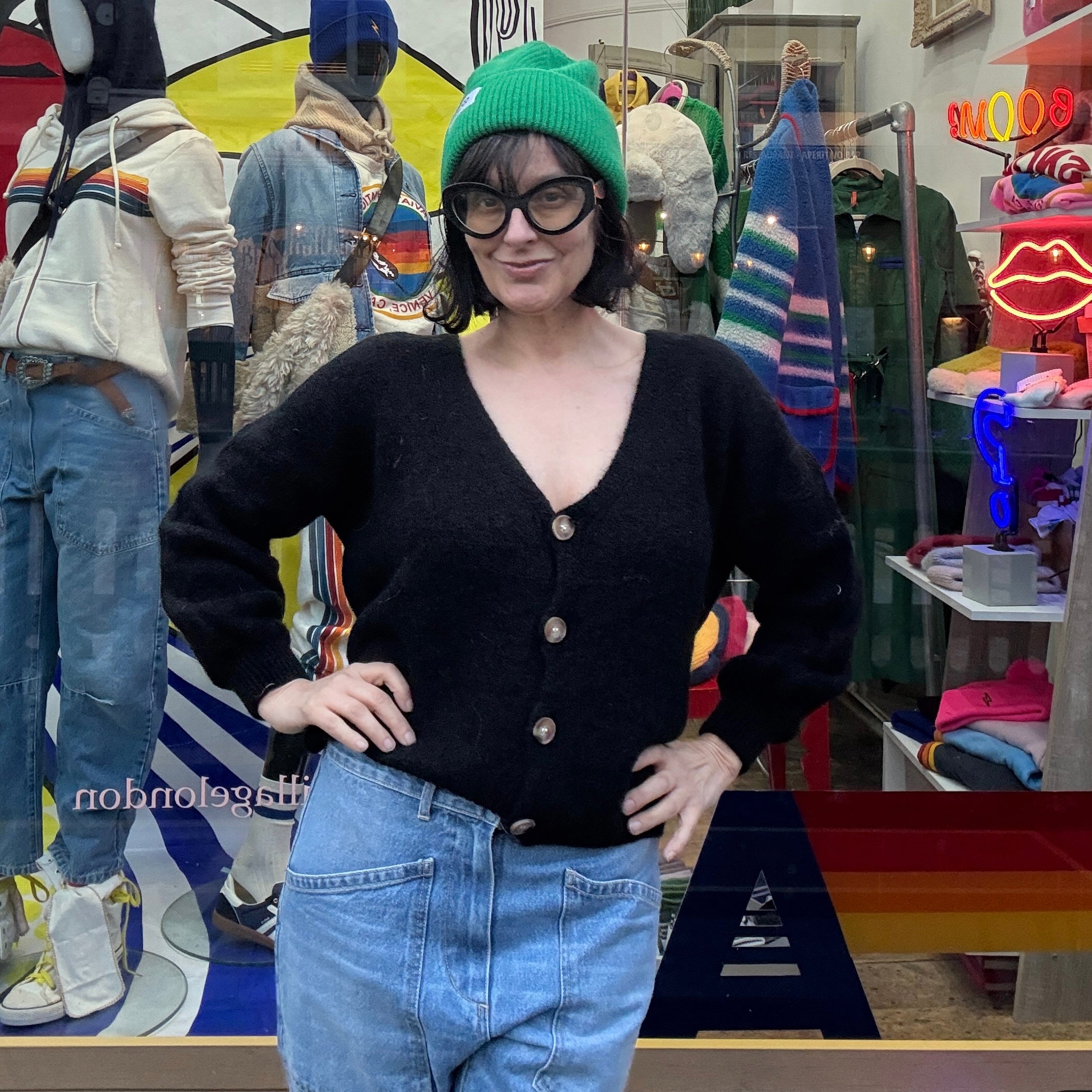 We love this new silhouette - a pretty v-necked, button-up cardigan in the softest mohair mix and tortoise shell buttons. One size.