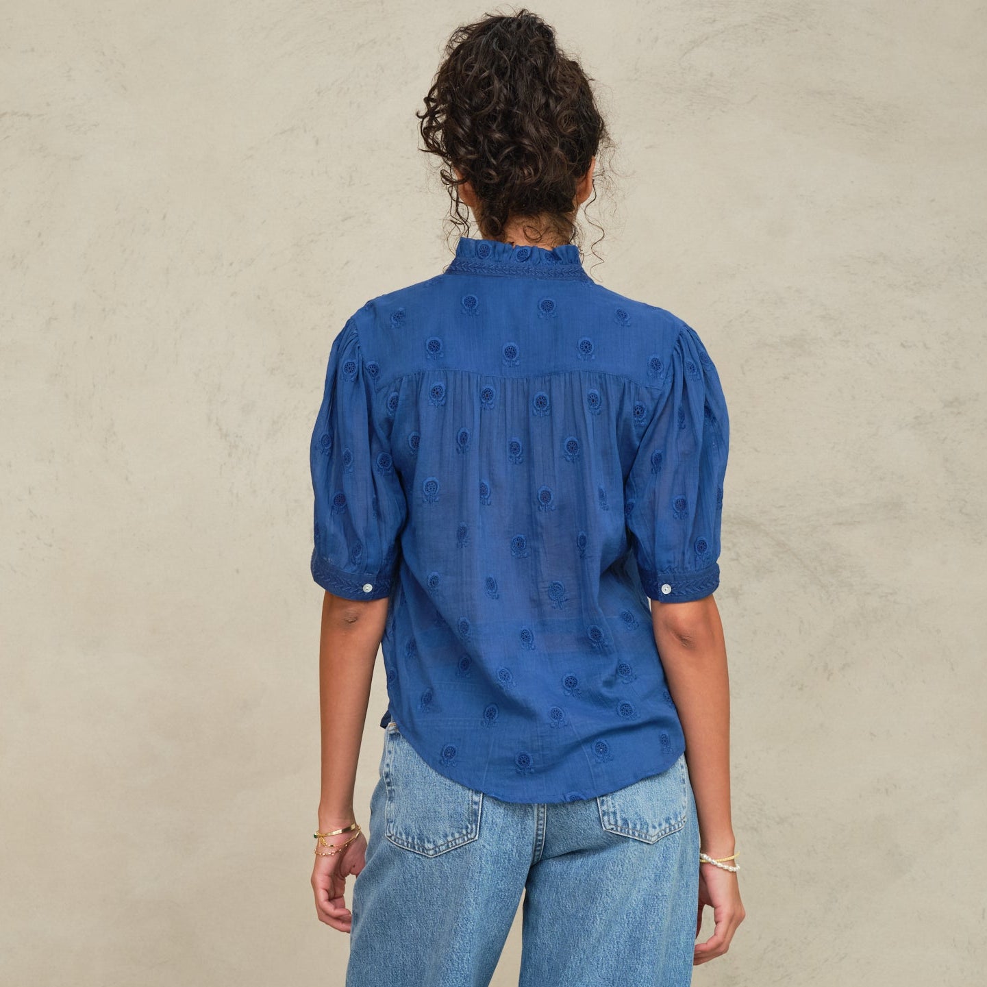The Frani top is designed with a soft stand collar, a full button-front closure, and gently gathered short sleeves finished with embroidered trim. Crafted from a lightweight, breathable fabric, it features delicate tonal embroidery.