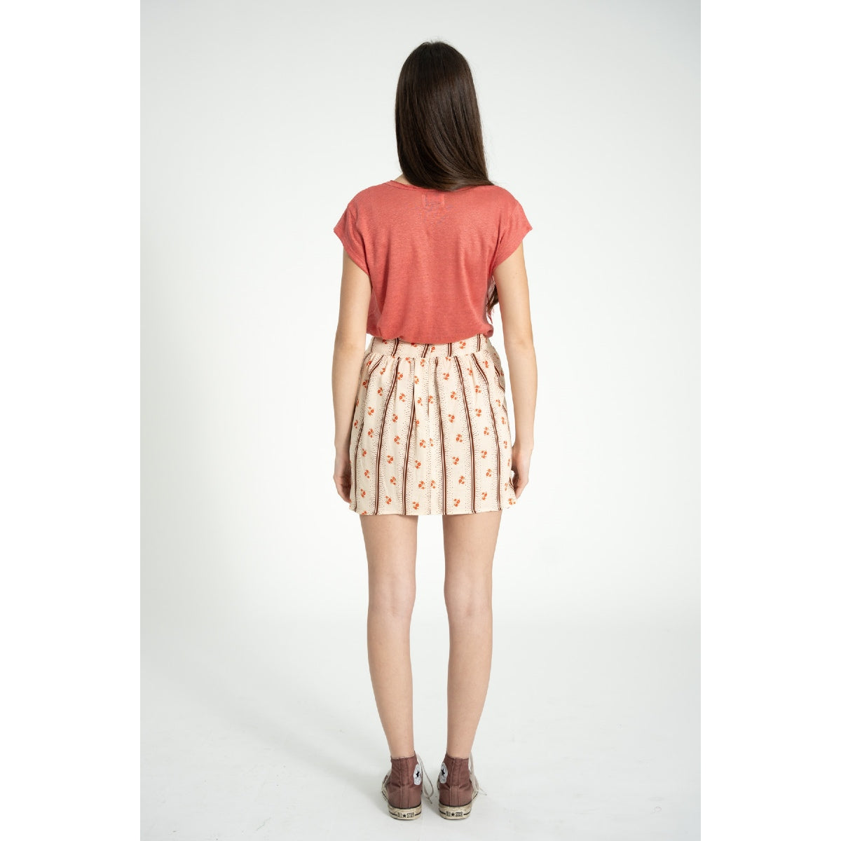 Sleeveless Coral top with a deep round neck and small arrow logo printed on the front.