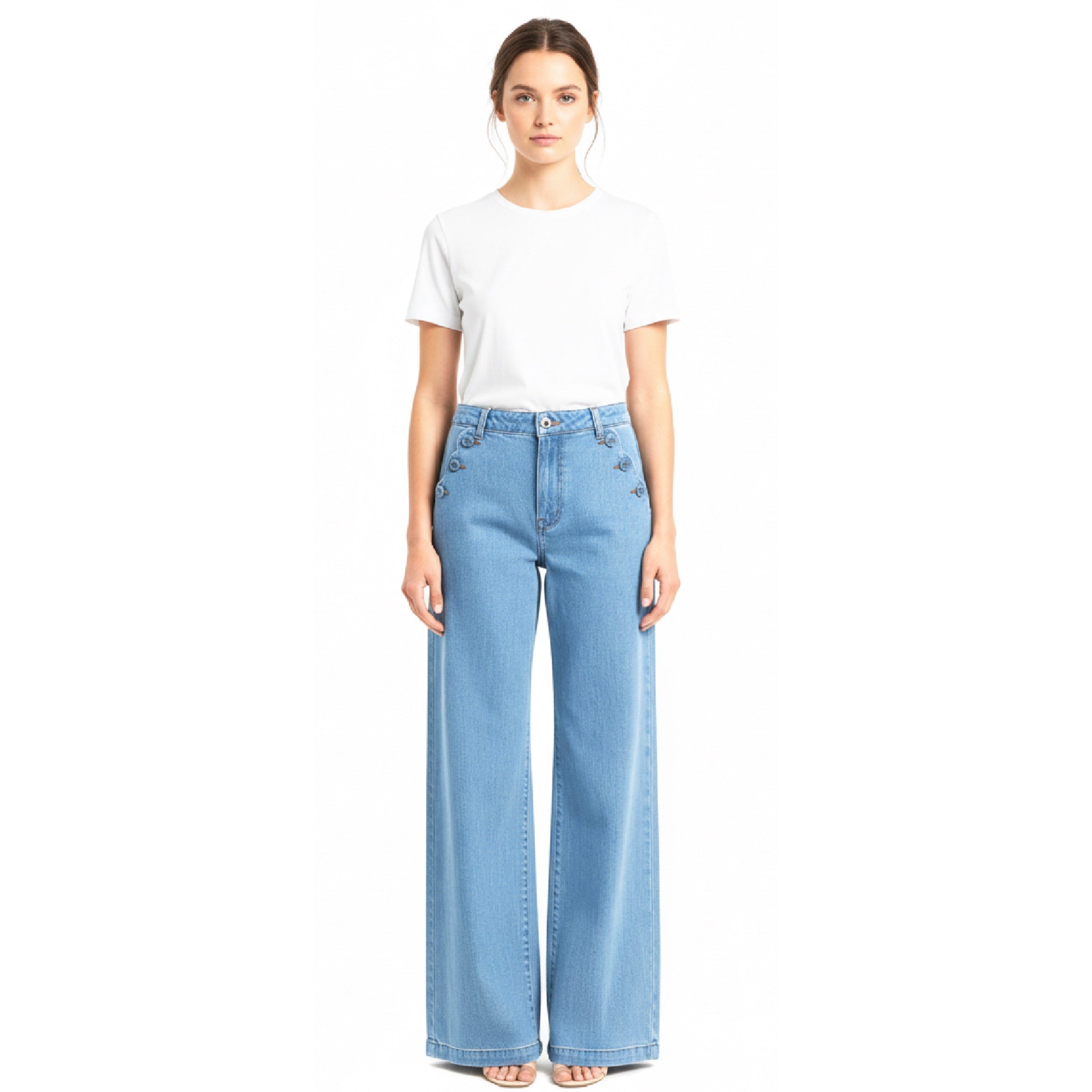 A recut of Emile's super popular Barnabe Jeans which are a modern denim take on the classic sailor pant style. Barnabe features super pretty button-down scallop-edged slide in pockets to the right and left side. The scallop is also repeated on the back pockets in a stand-out gold thread. The jeans silhouette is an easy-fit, mid rise, straight cut.