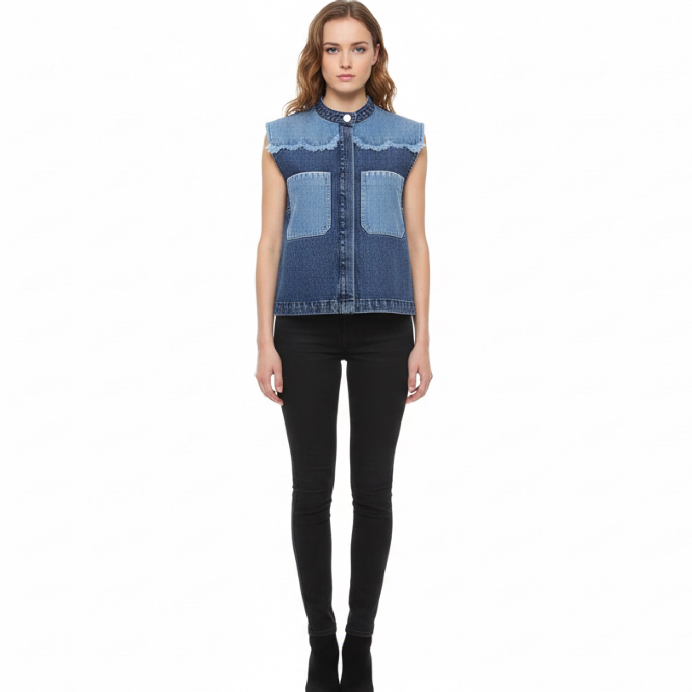 The perfect denim vest with scallop frayed details.
