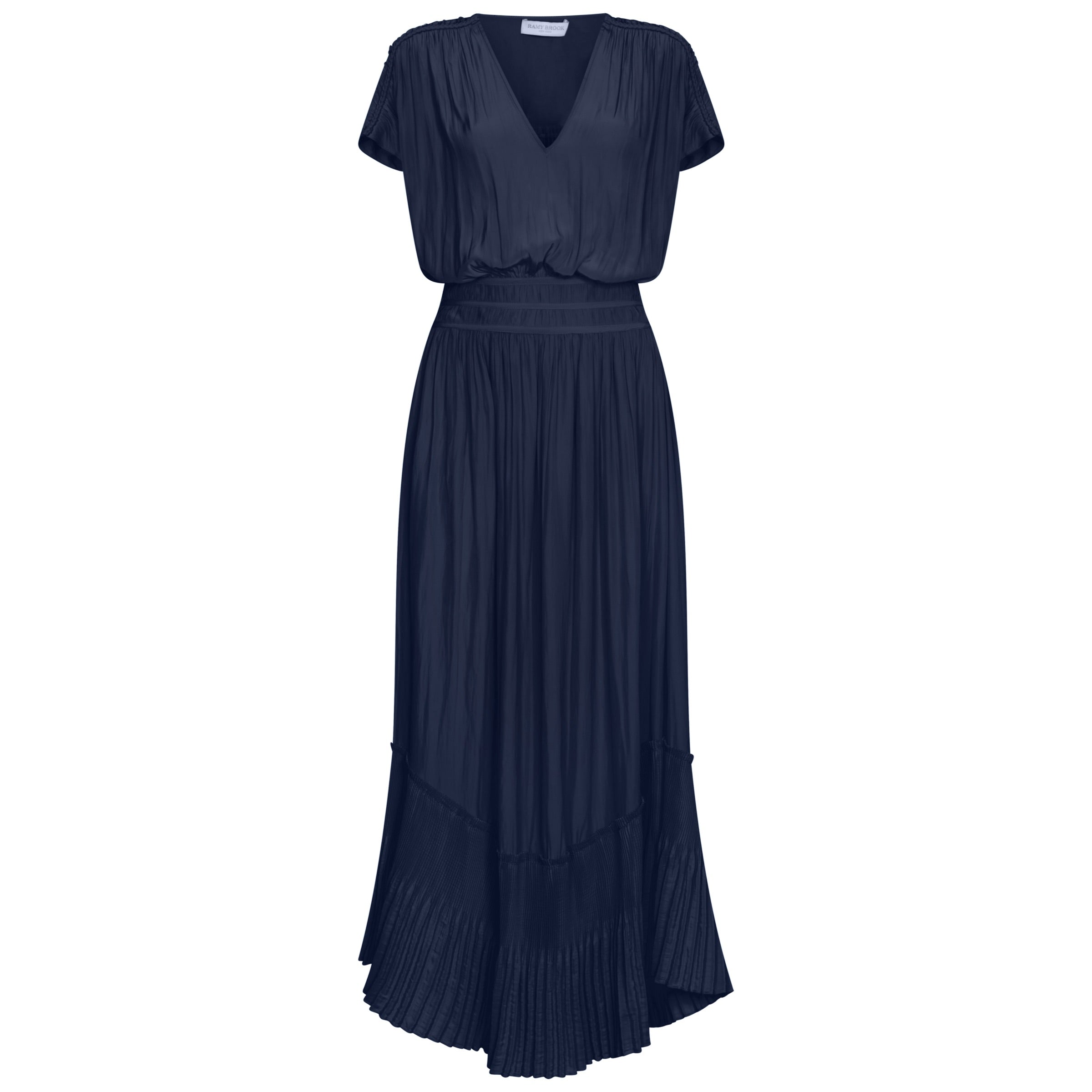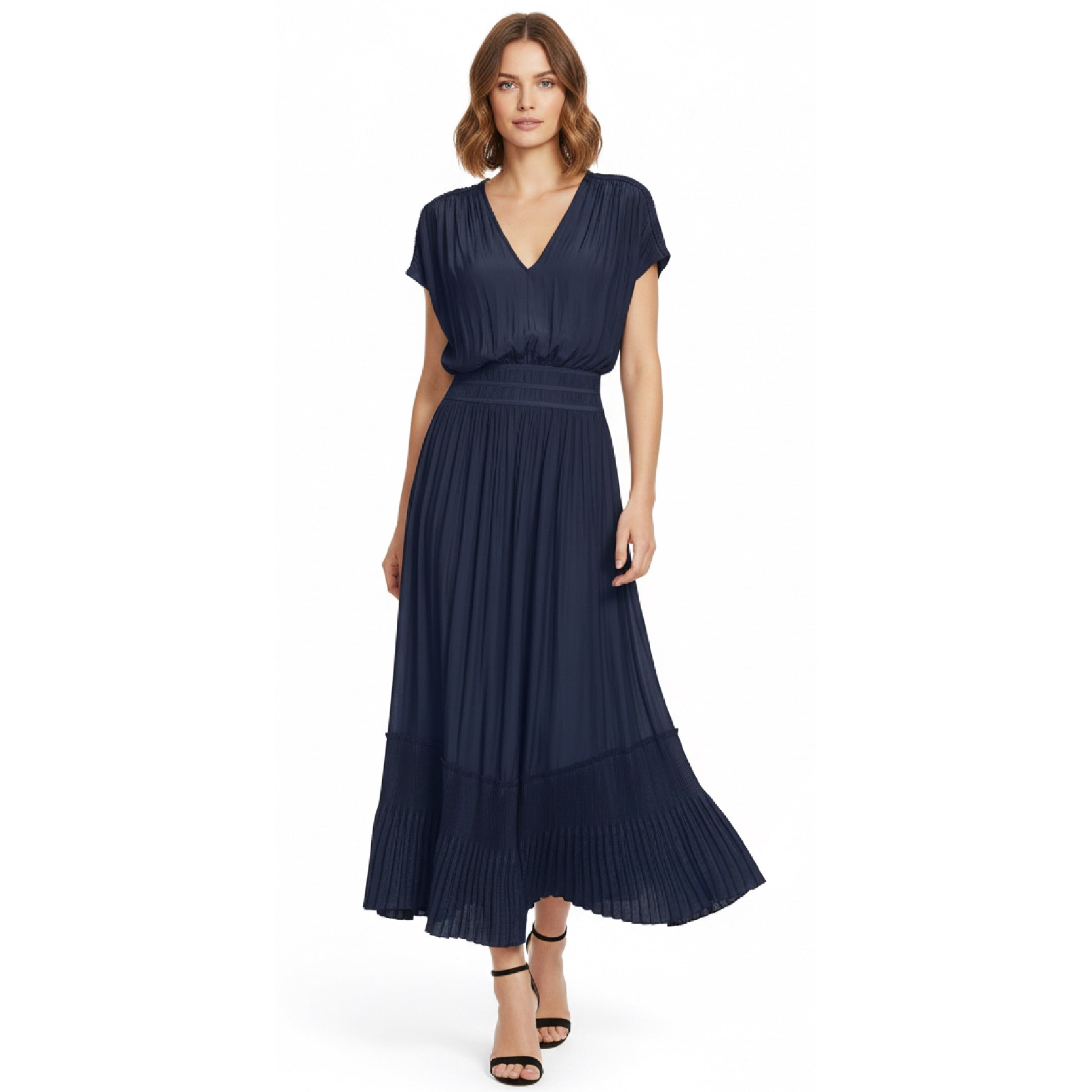 Stunning statement dress by Ramy Brook featuring a pretty short sleeve, Ramy’s signature shirred waist for easy fit giving out to beautifully fluid skirt. Drops to mid calf depending on height.