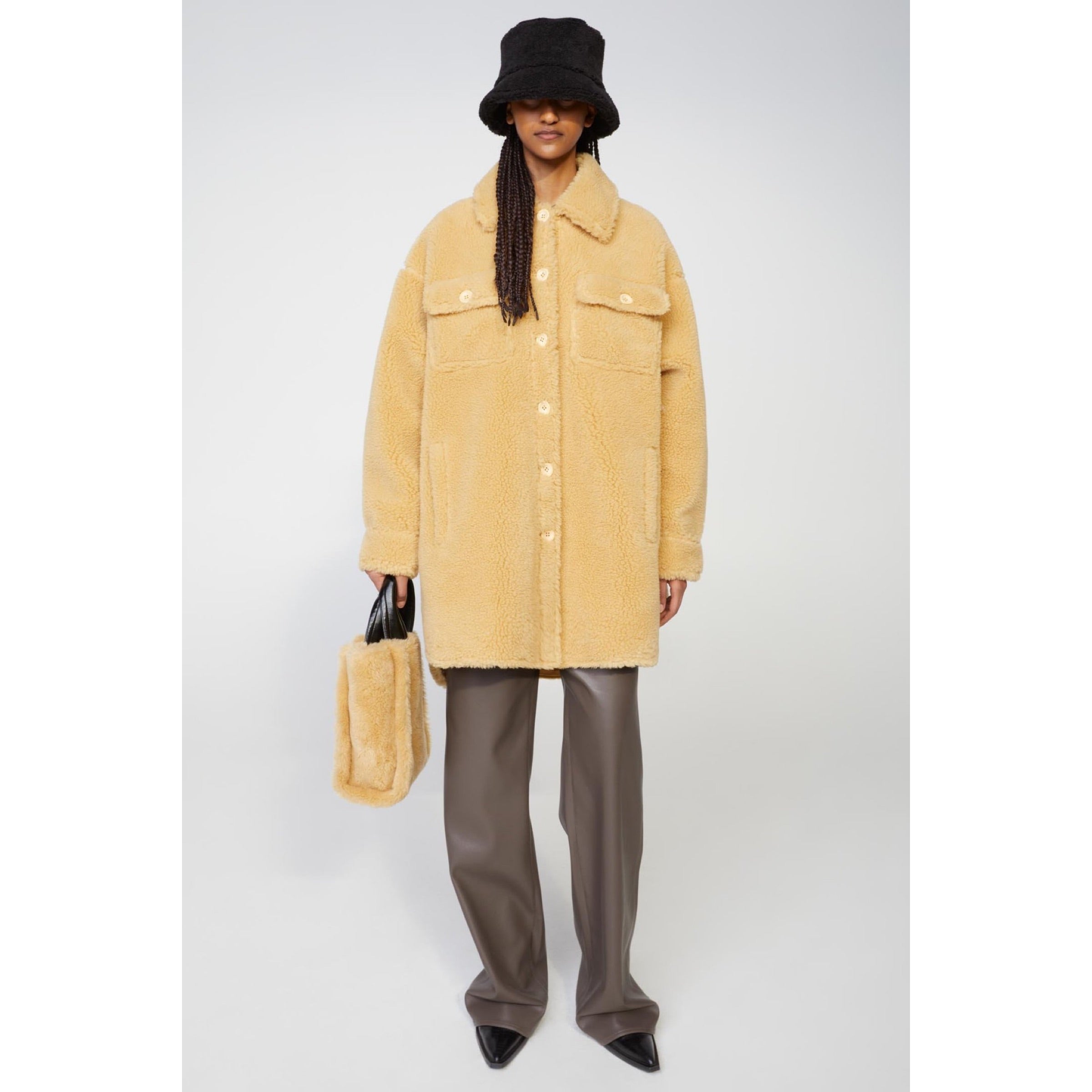 Sabi is an oversized shirt-style jacket crafted from warming wool-blend faux fur. It's designed with a point collar, breast pockets and front button fastenings. The perfect outer layer for a Sunday stroll.