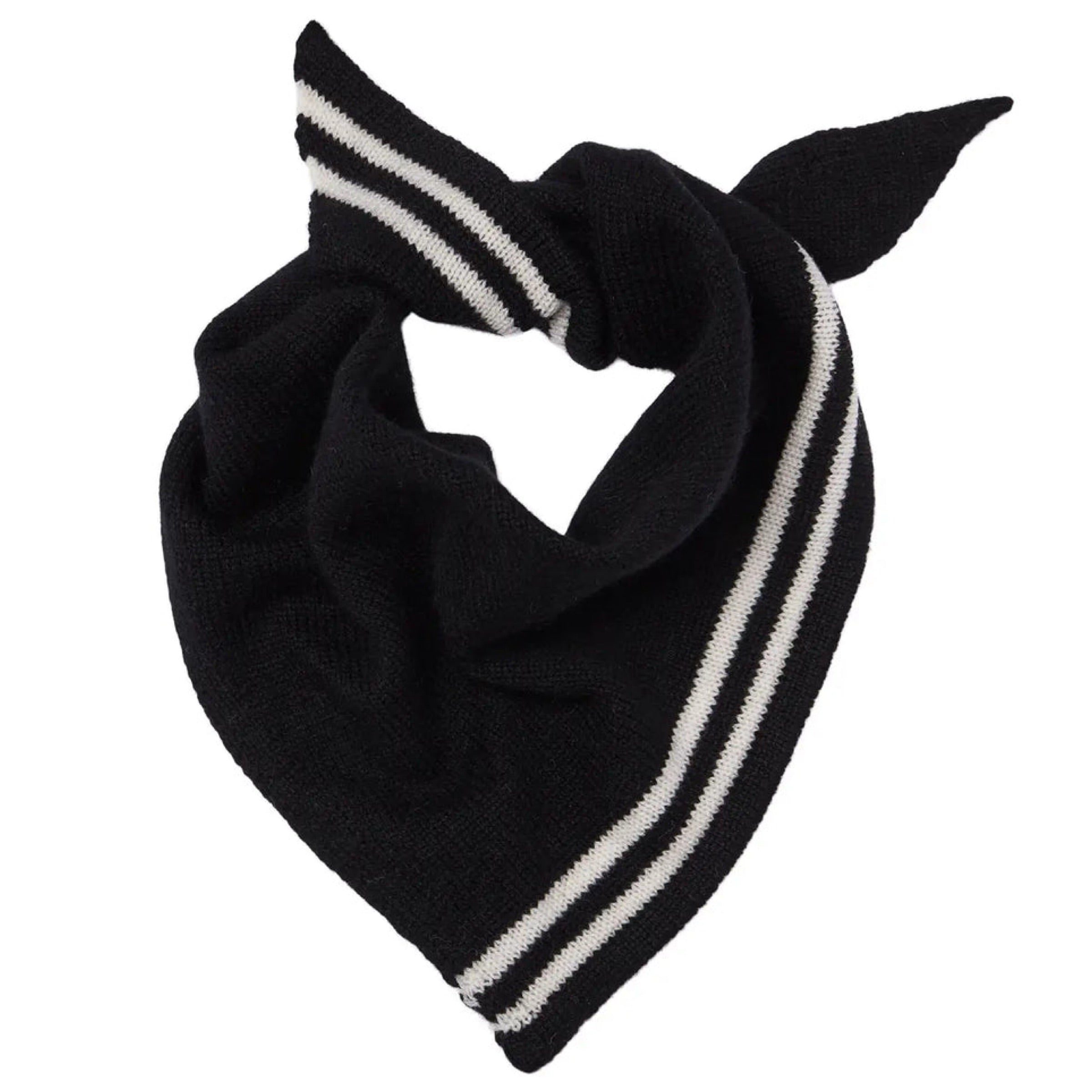 Black cashmere triangle neckerchief scarf with two stripe detail.