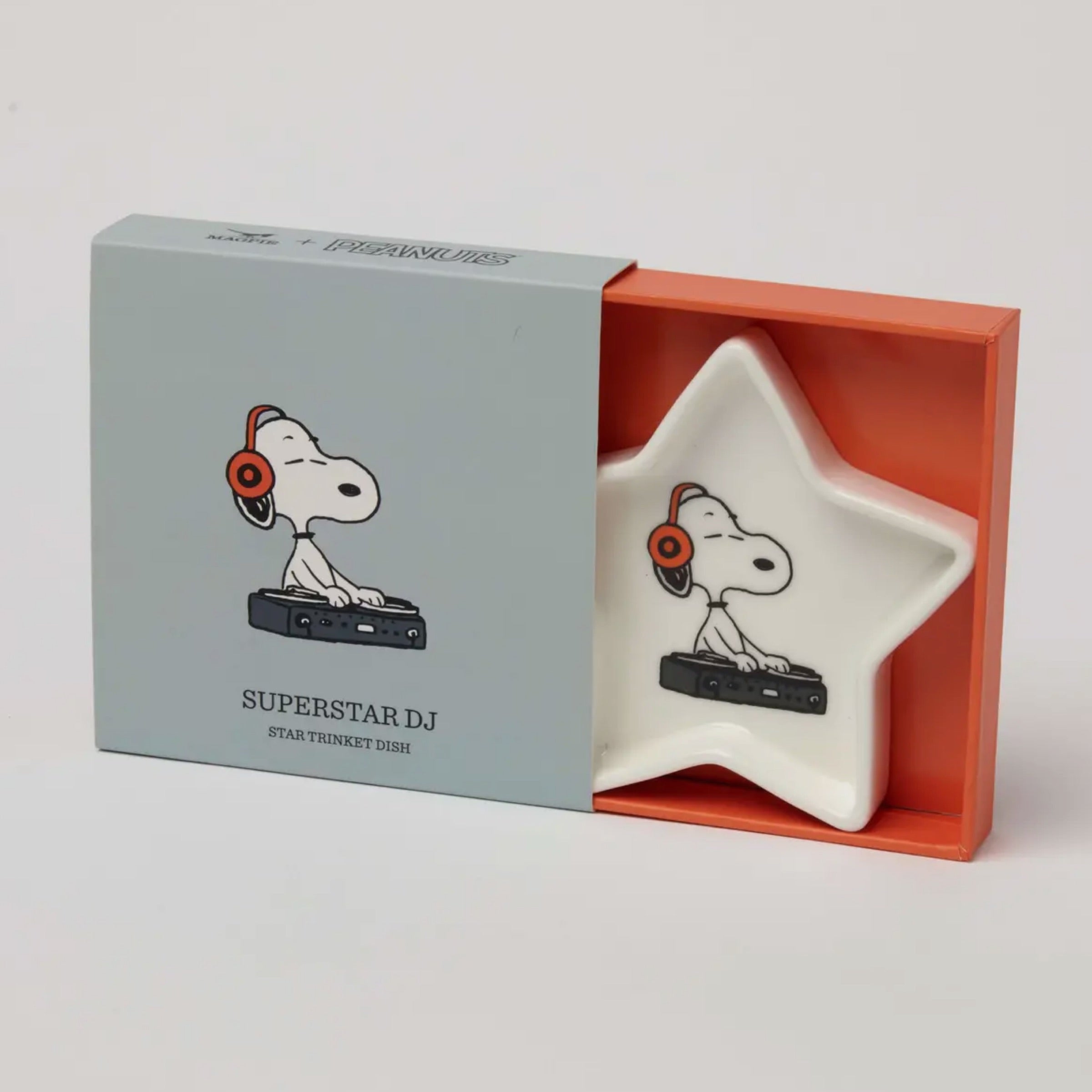 Cute 10cm star shaped vegan ceramic shaped dish/tray. Decorated with DJ Snoopy on the decks. With slide out colourful gift box.