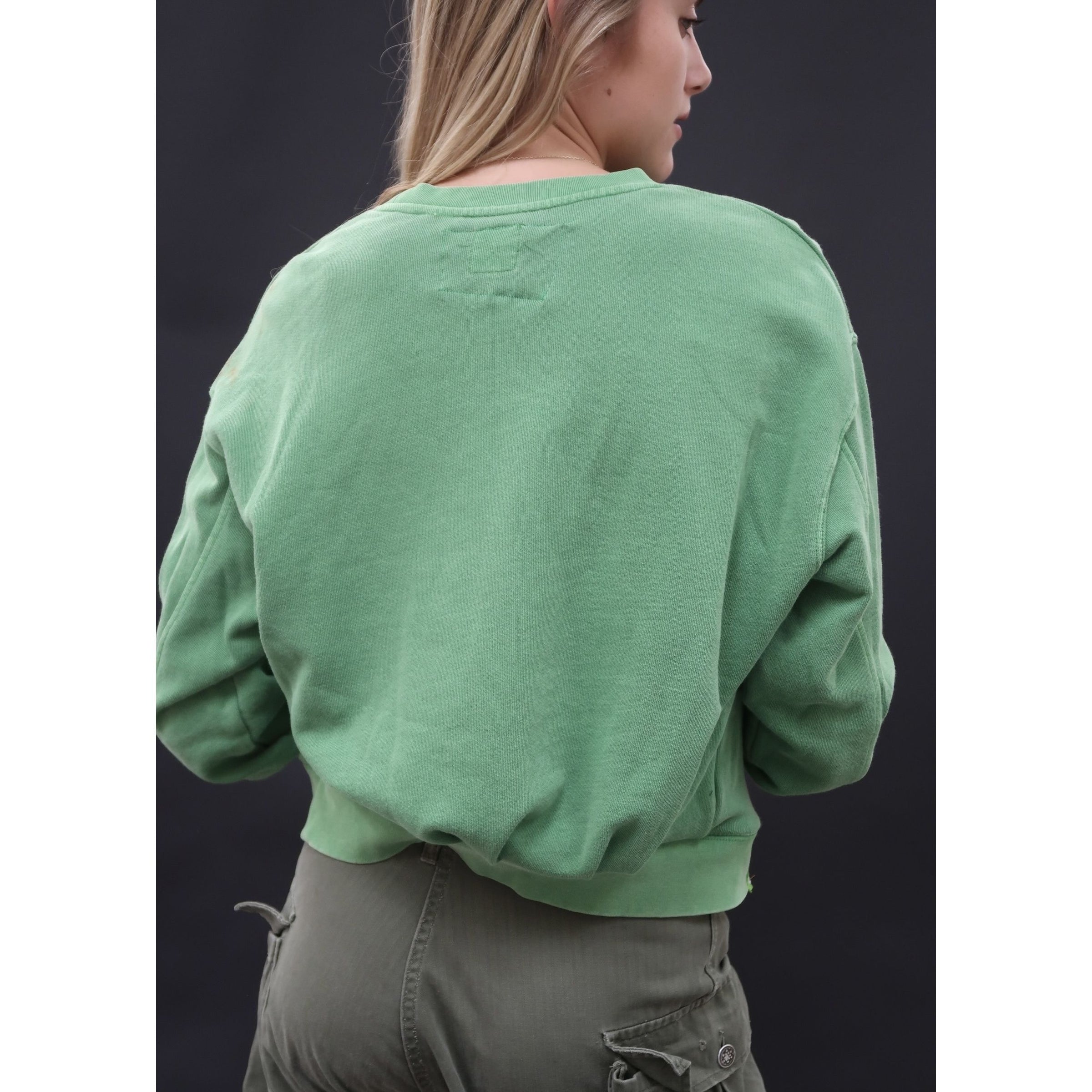 Enjoy this vibrant green vintage snoopy sweat. Includes a snoopy bicycle print and two coloured tabs at the hem. The hem has been raised to create a shorter, more boxy fit. Features a blue and white gingham patch on the sleeve.