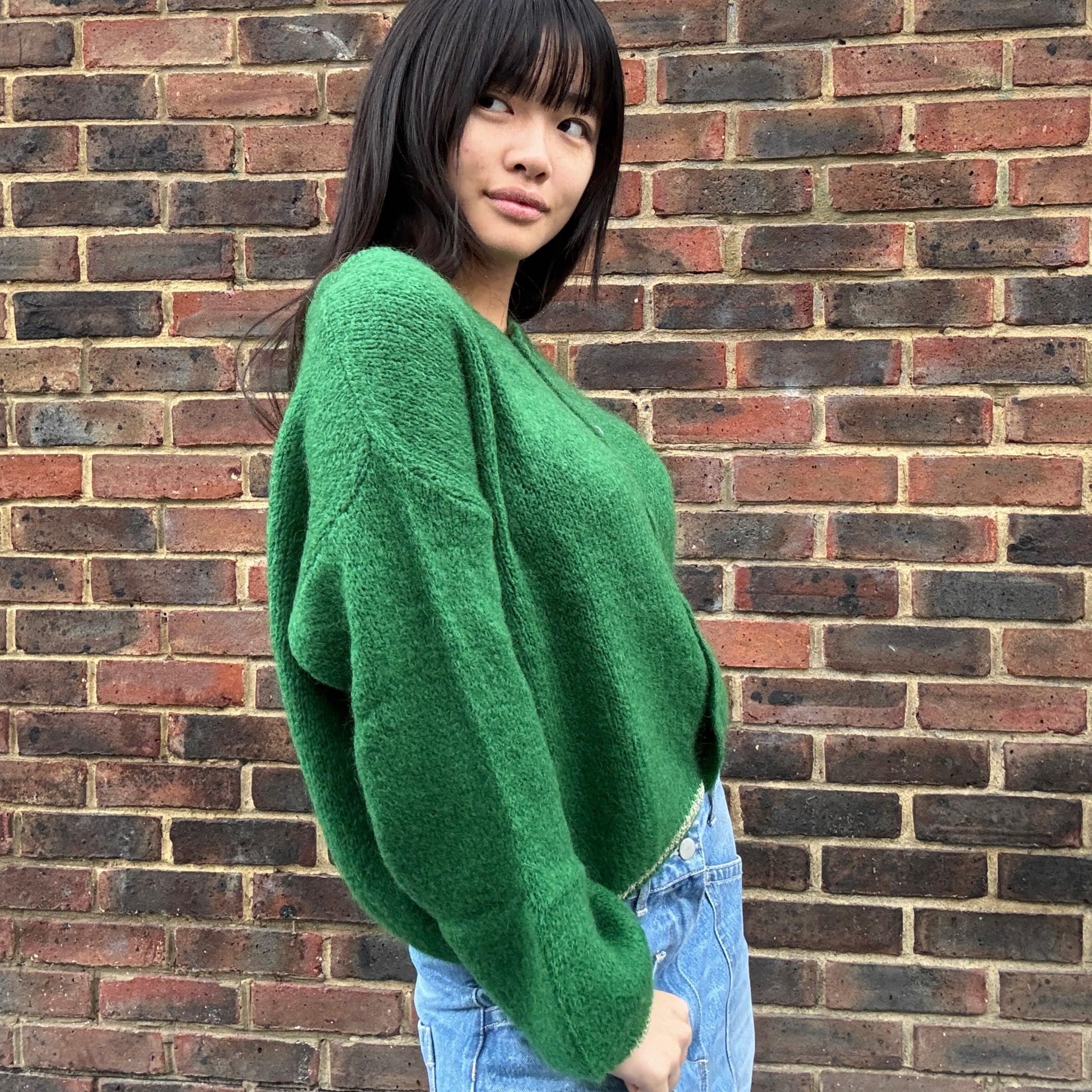 We love this new silhouette - a pretty v-necked, button-up cardigan in the softest mohair mix and tortoise shell buttons. One size.