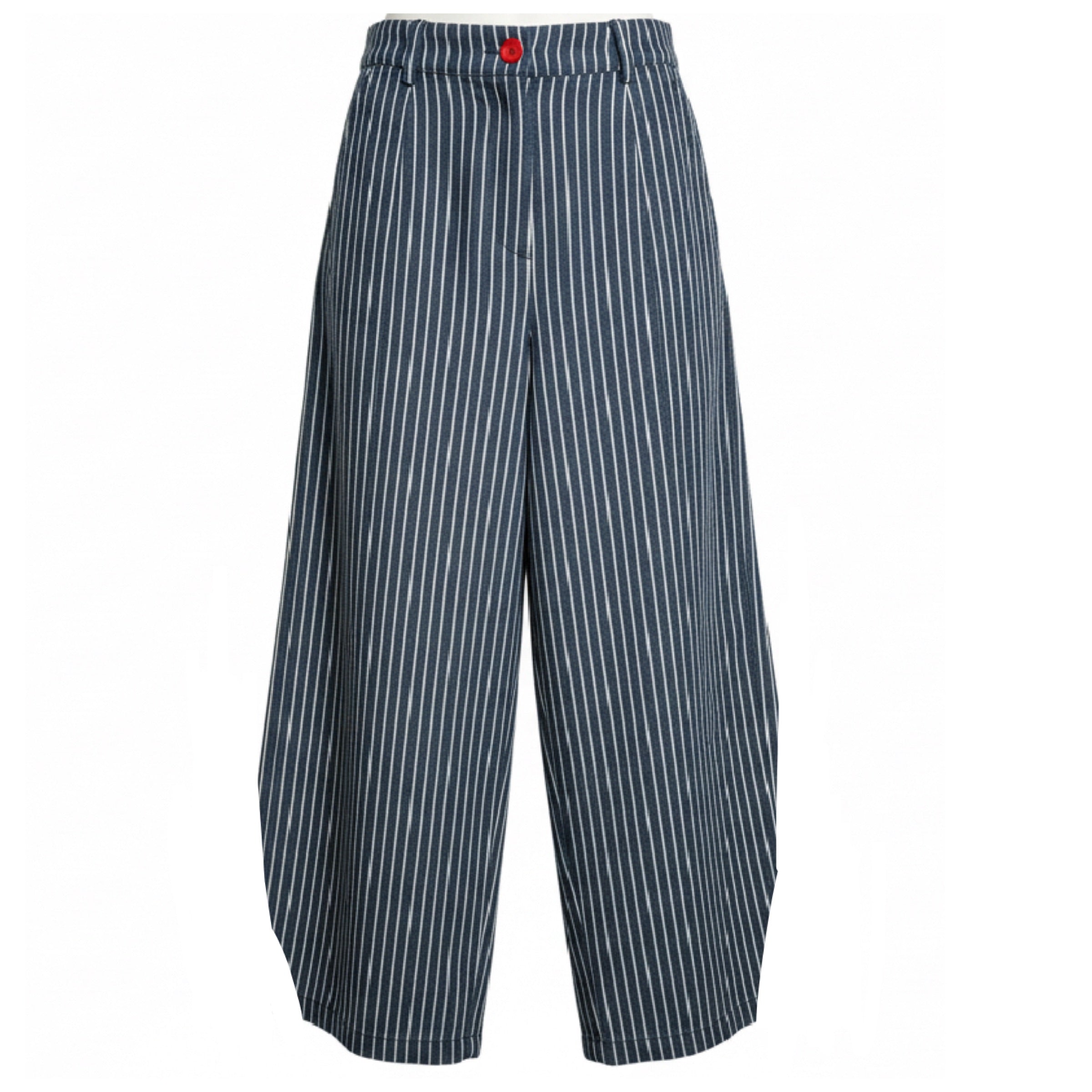 We adore these super flattering barrels. Created in a jaunty navy stripe with red button closure, they will make such a great addition to your new season wardrobe. Cut is key when choosing a barrel and these will not disappoint. Matching workwear jacket available.