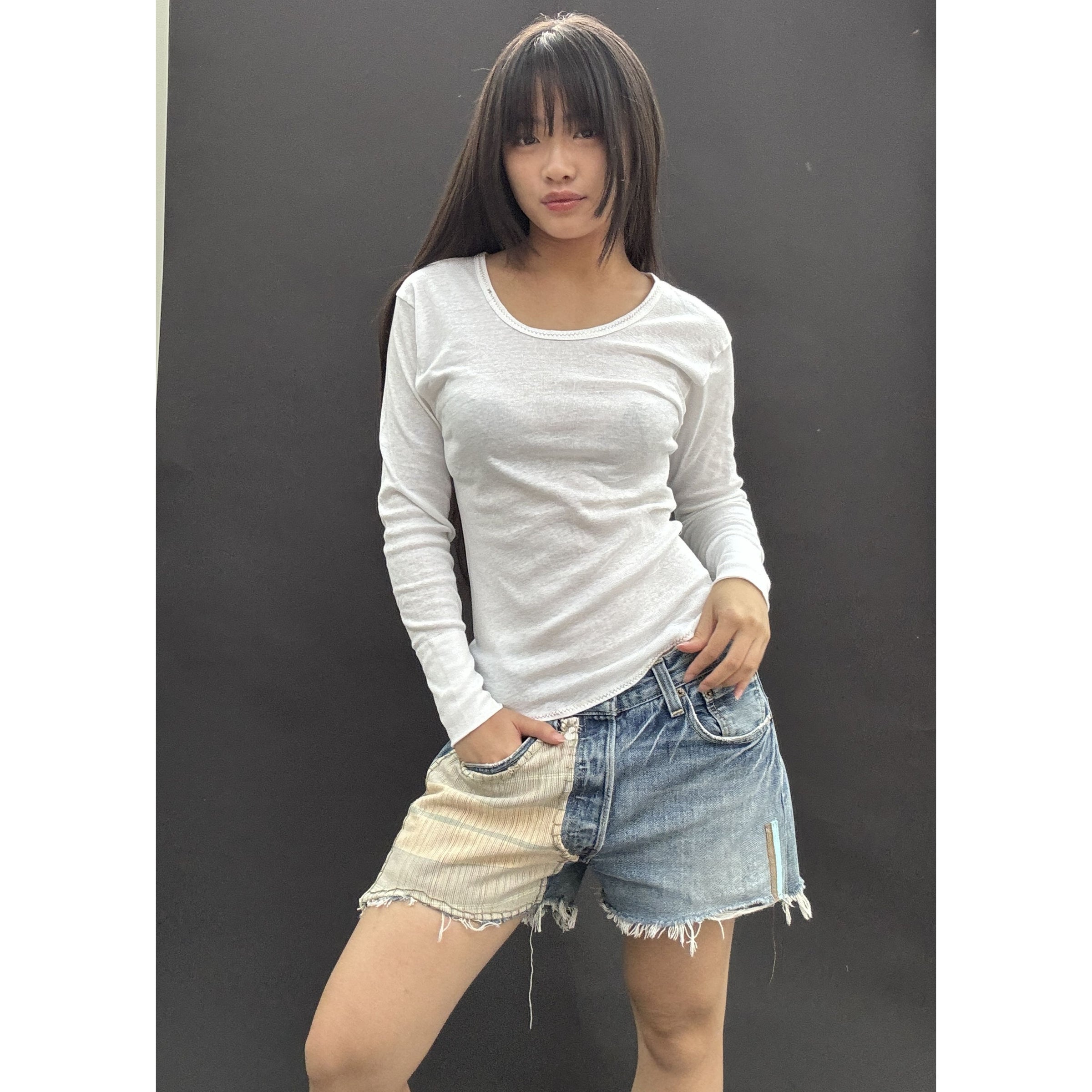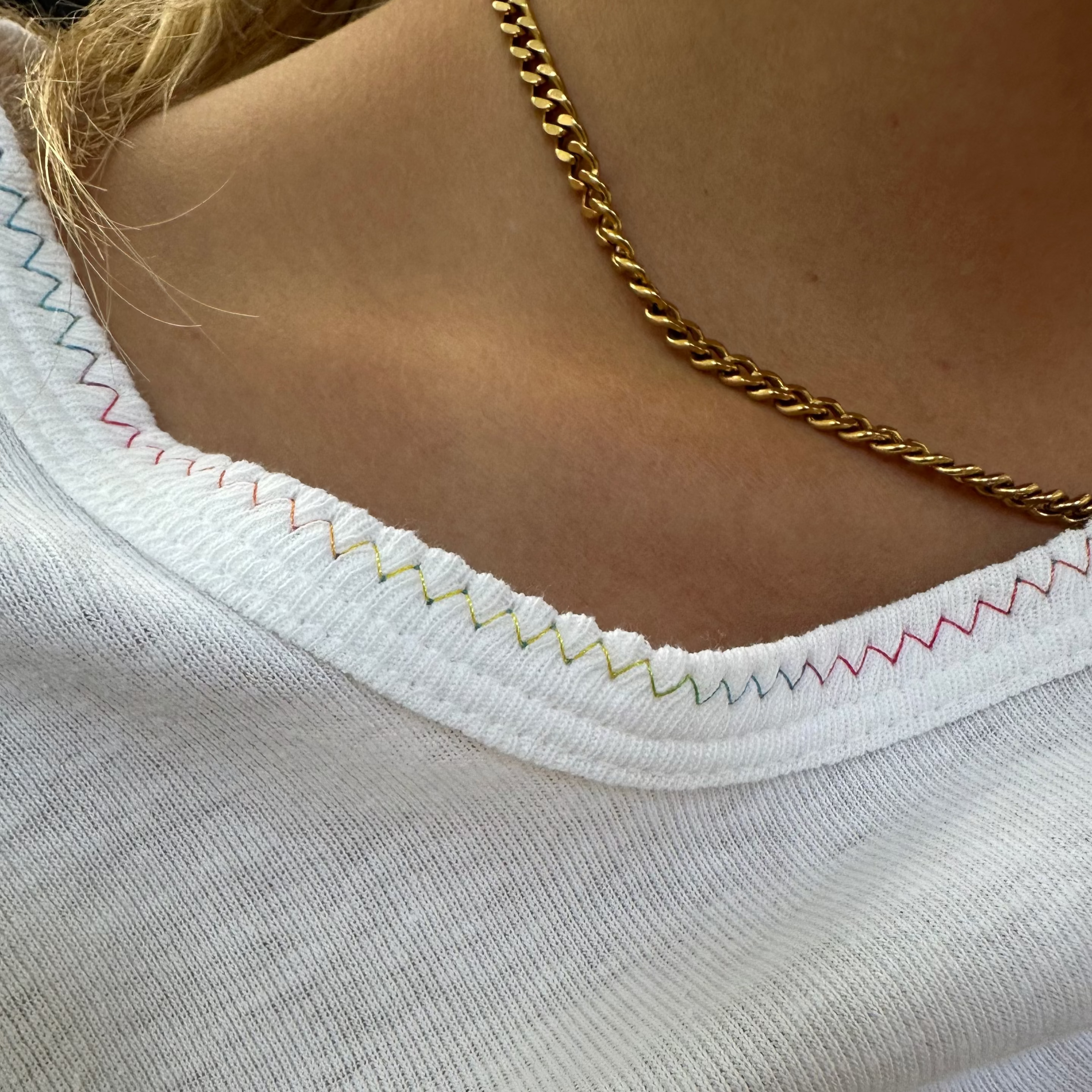 White long sleeve top with rainbow stitching at the neckline and hems, and our siganture double tab at the back neckline.