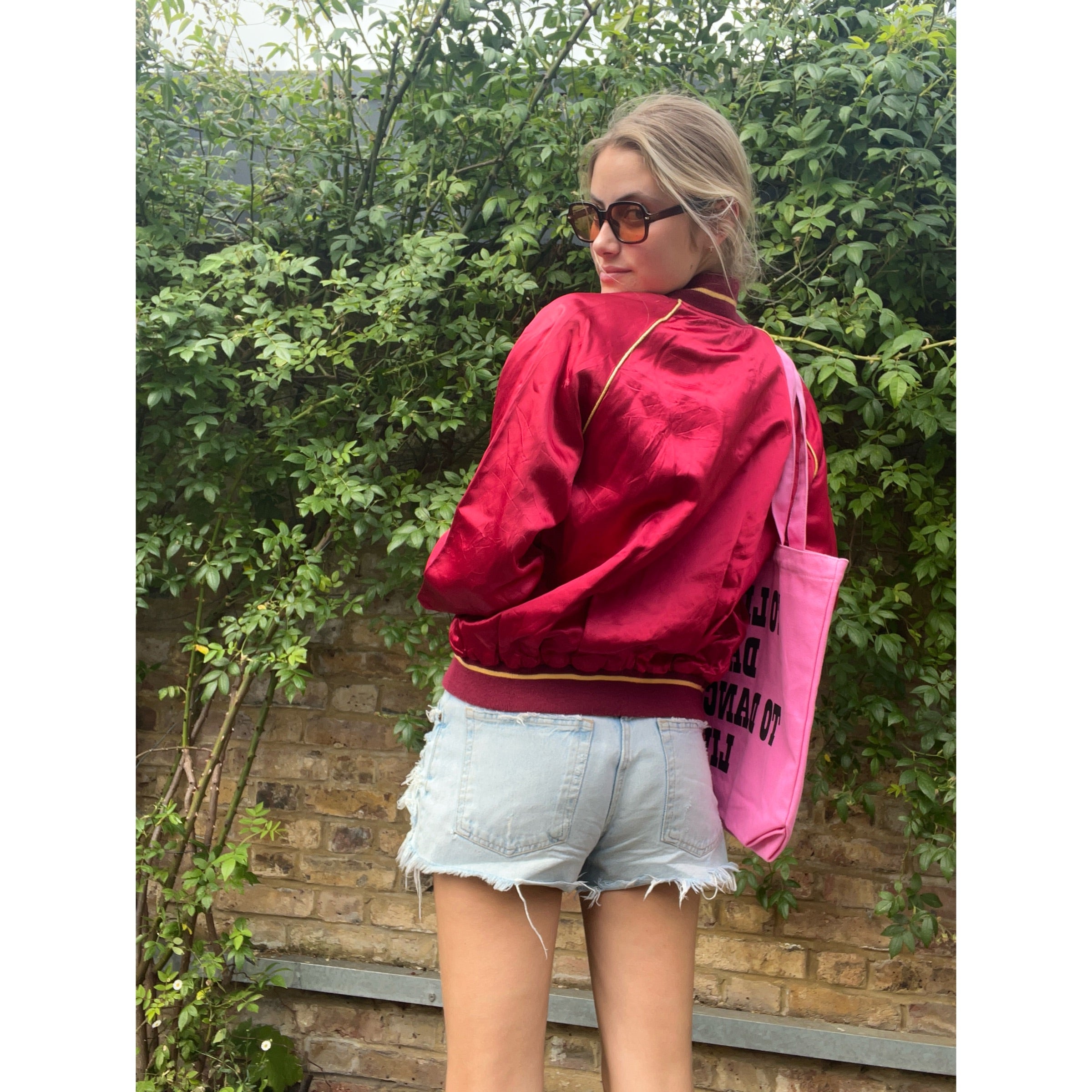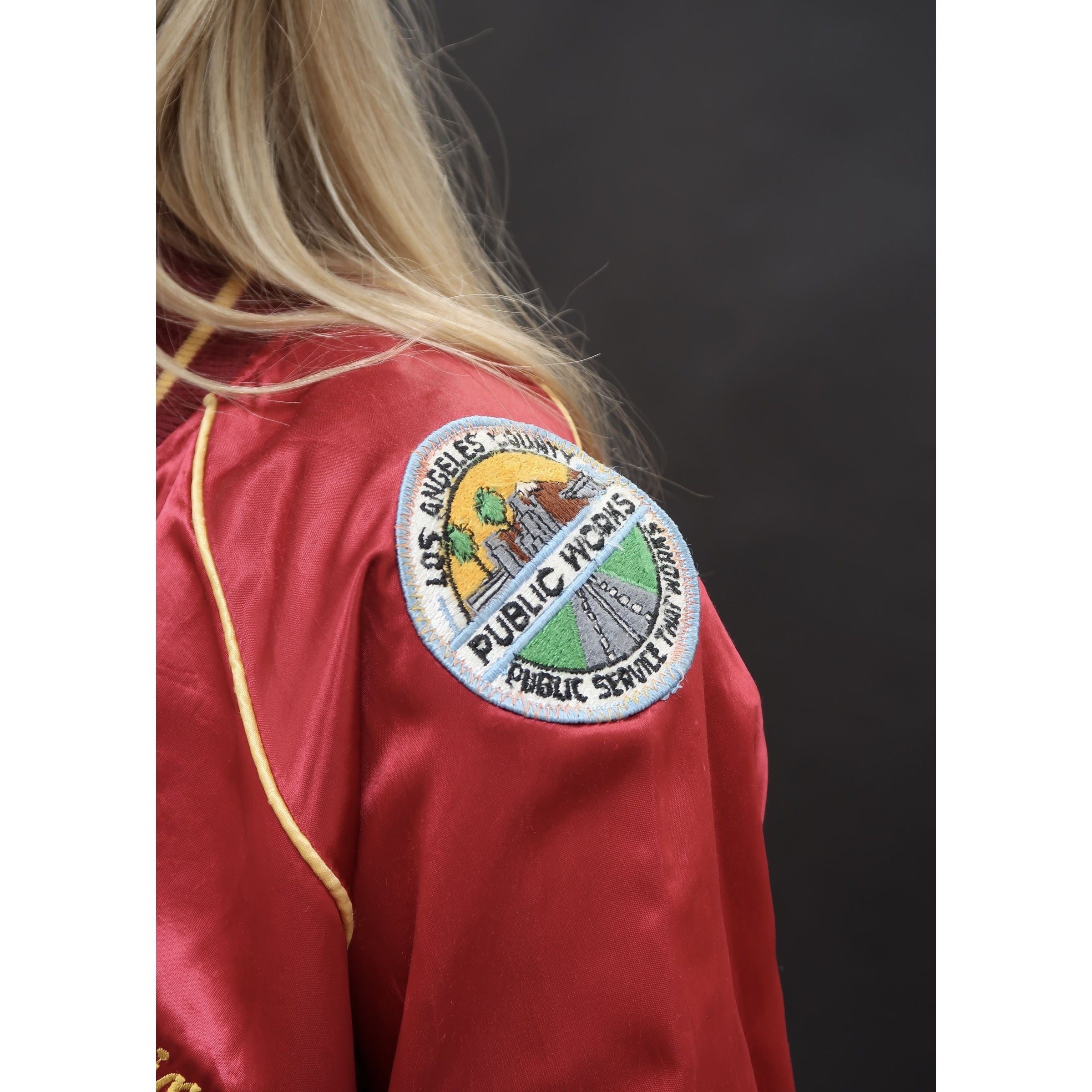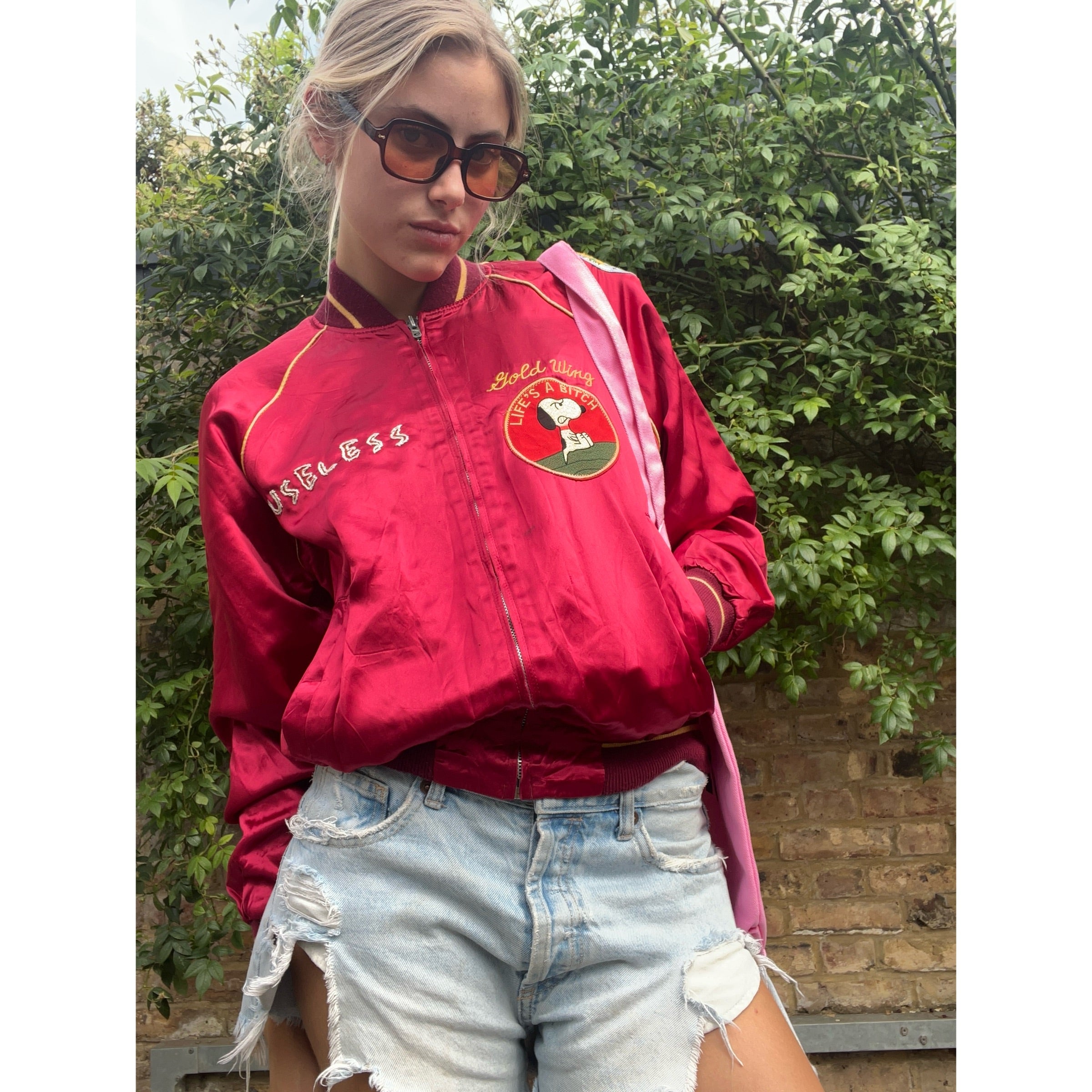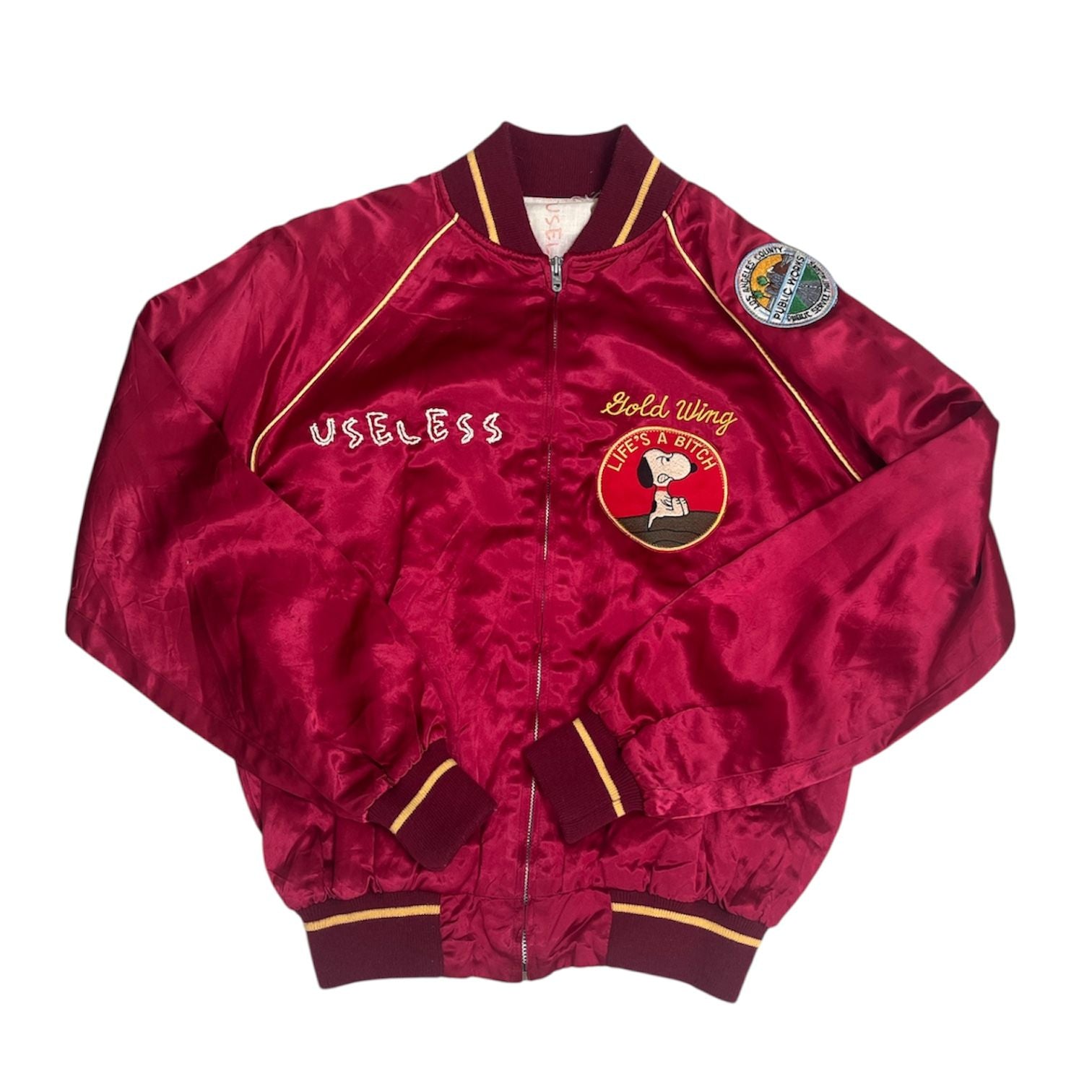 Enjoy this statement, varsity-style red satin bomber. Includes 'Useless' embroidered in yellow darn across the right hand breast and a snoopy stitched-on patch on the left breast, as well as an additional patch on the left hand shoulder.