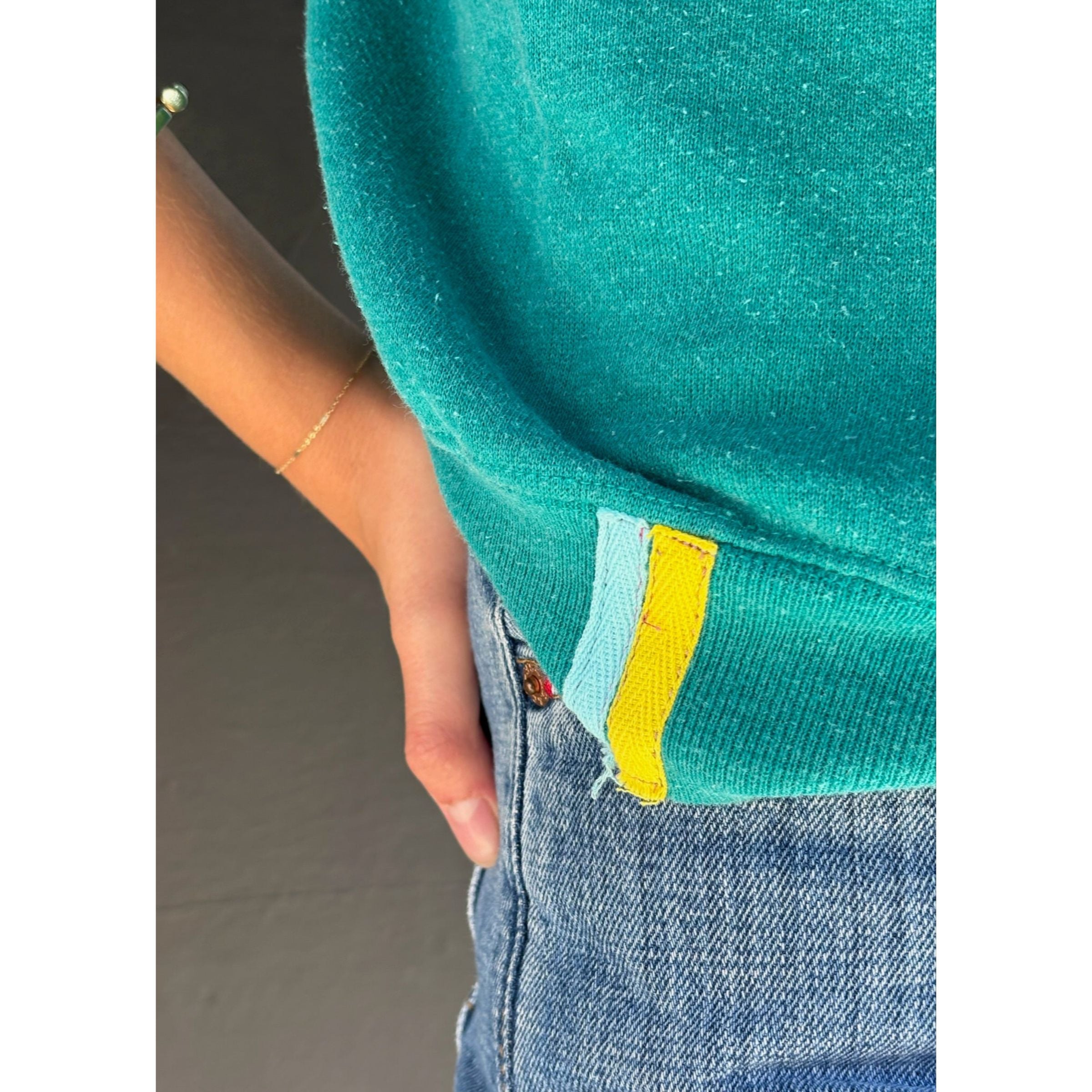 Teal short sleeve sweatshirt with hand-embroidered 'Useless' letters to the front plus matching double colour tab to the hem.