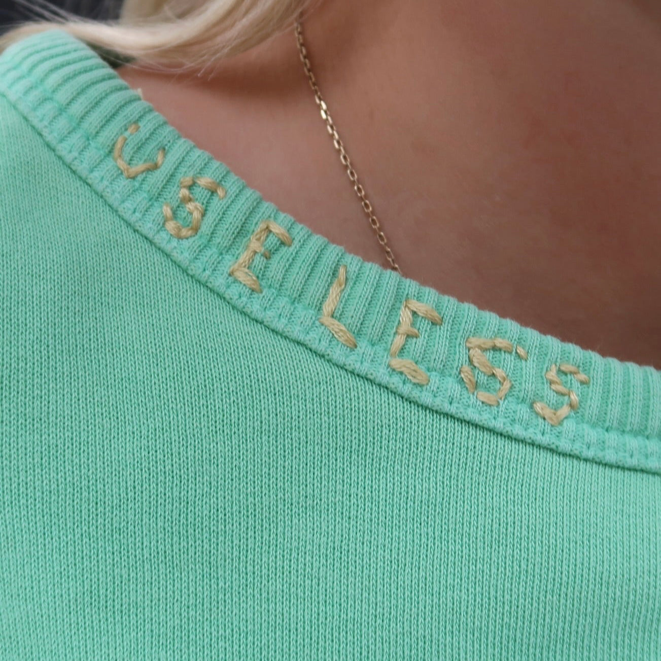 Enjoy this vibrant green vintage snoopy sweat. Includes a snoopy character on the front body, decorated with appliquéd 'Useless' Patches, sown on with multi-coloured threads.