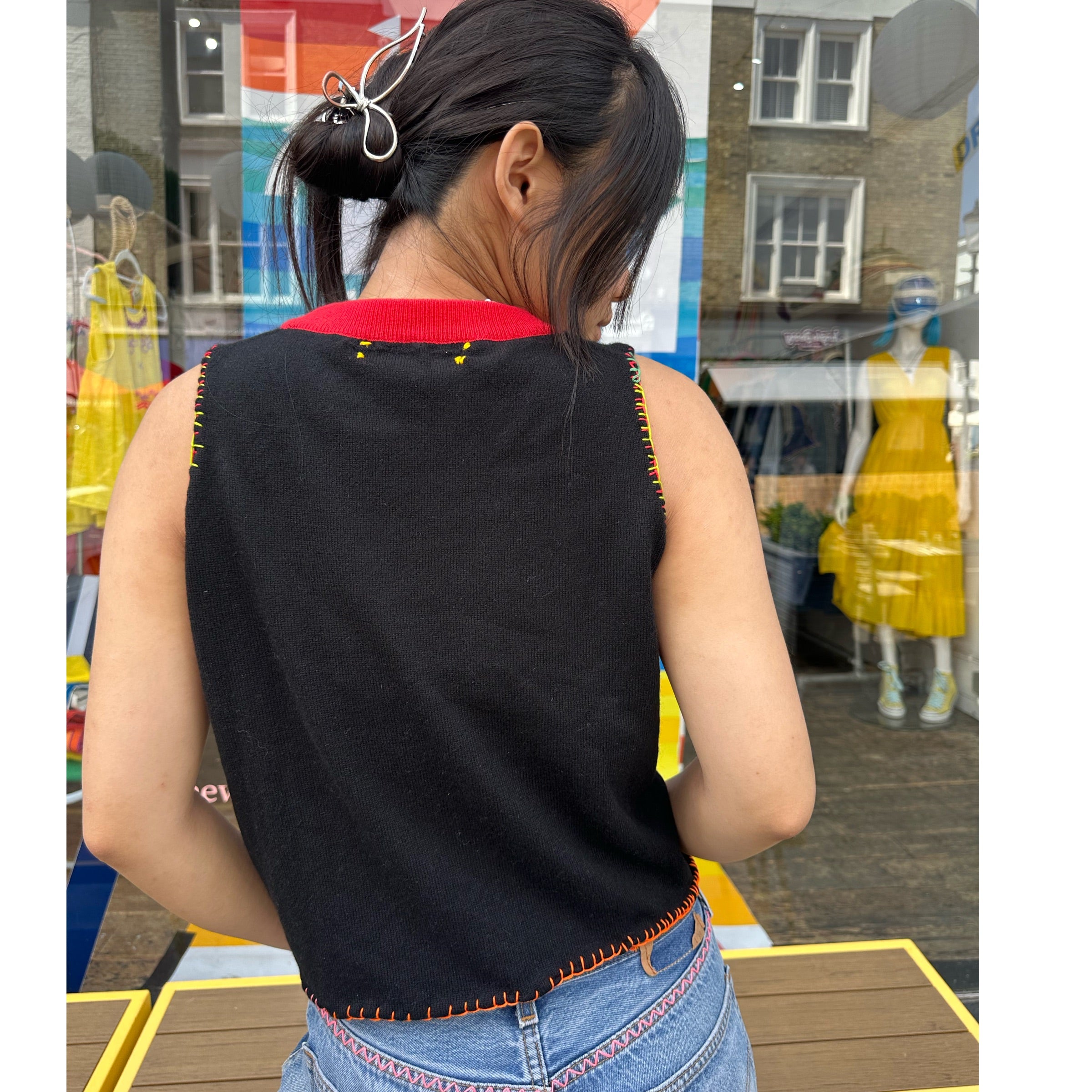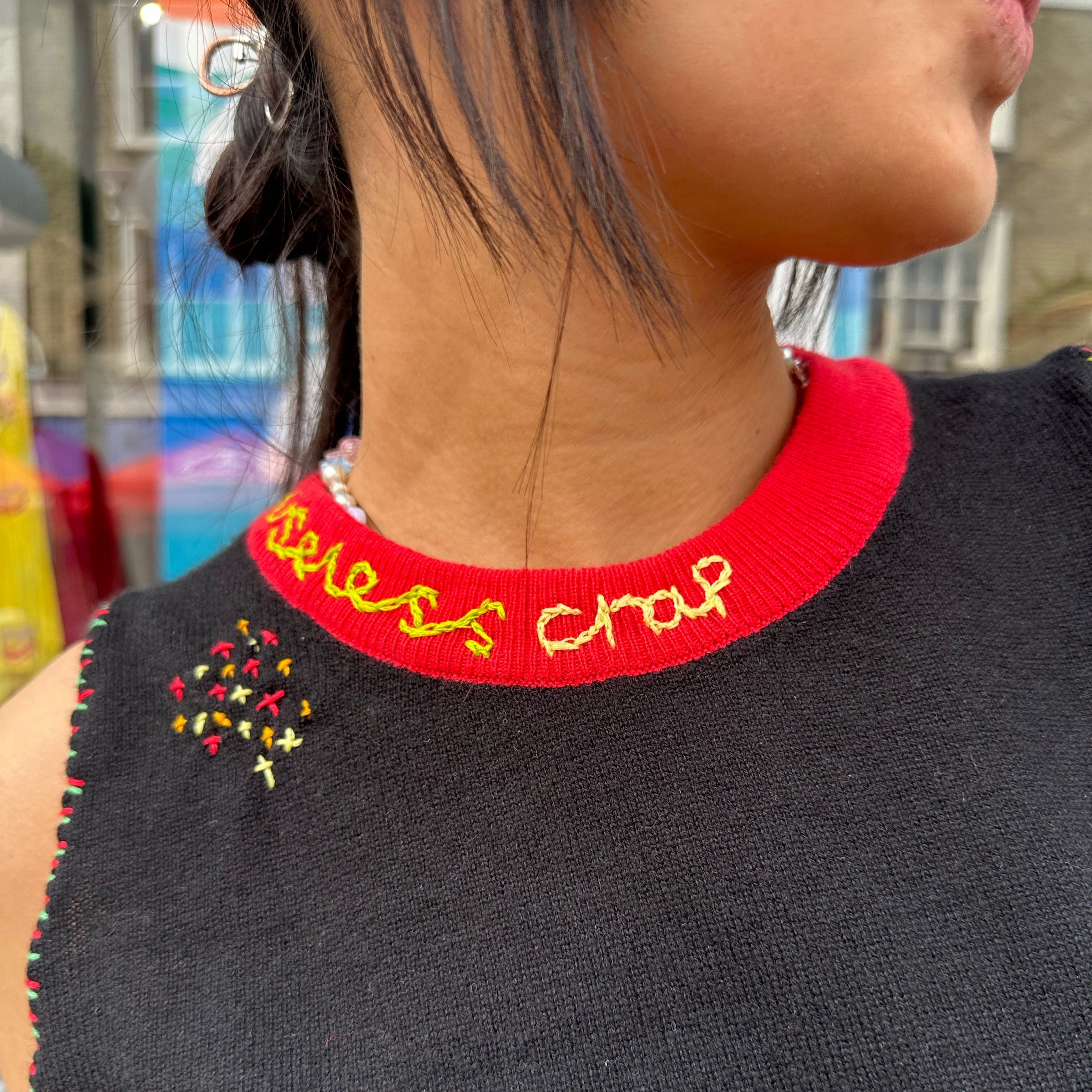 Fabulous hand-upcycled black cashmere tank with contrast red neck featuring blanket-stitching at the armhole and hem. Our hand-embroidered 'Useles Crap’ motif appears on thr front neck.