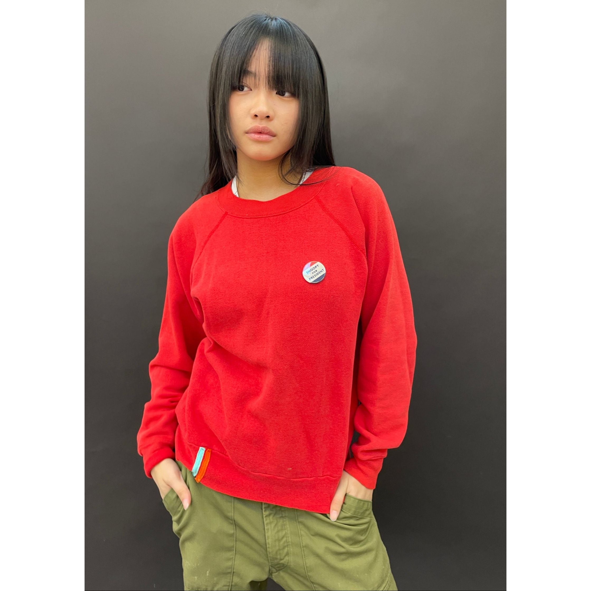 A vintage red sweatshirt which we have upcycled with a woodstock patch blanket stitched on the back, as well as a 'Snoopy for President' pin on the front. Also features our signature double tabs sewn to the hem.