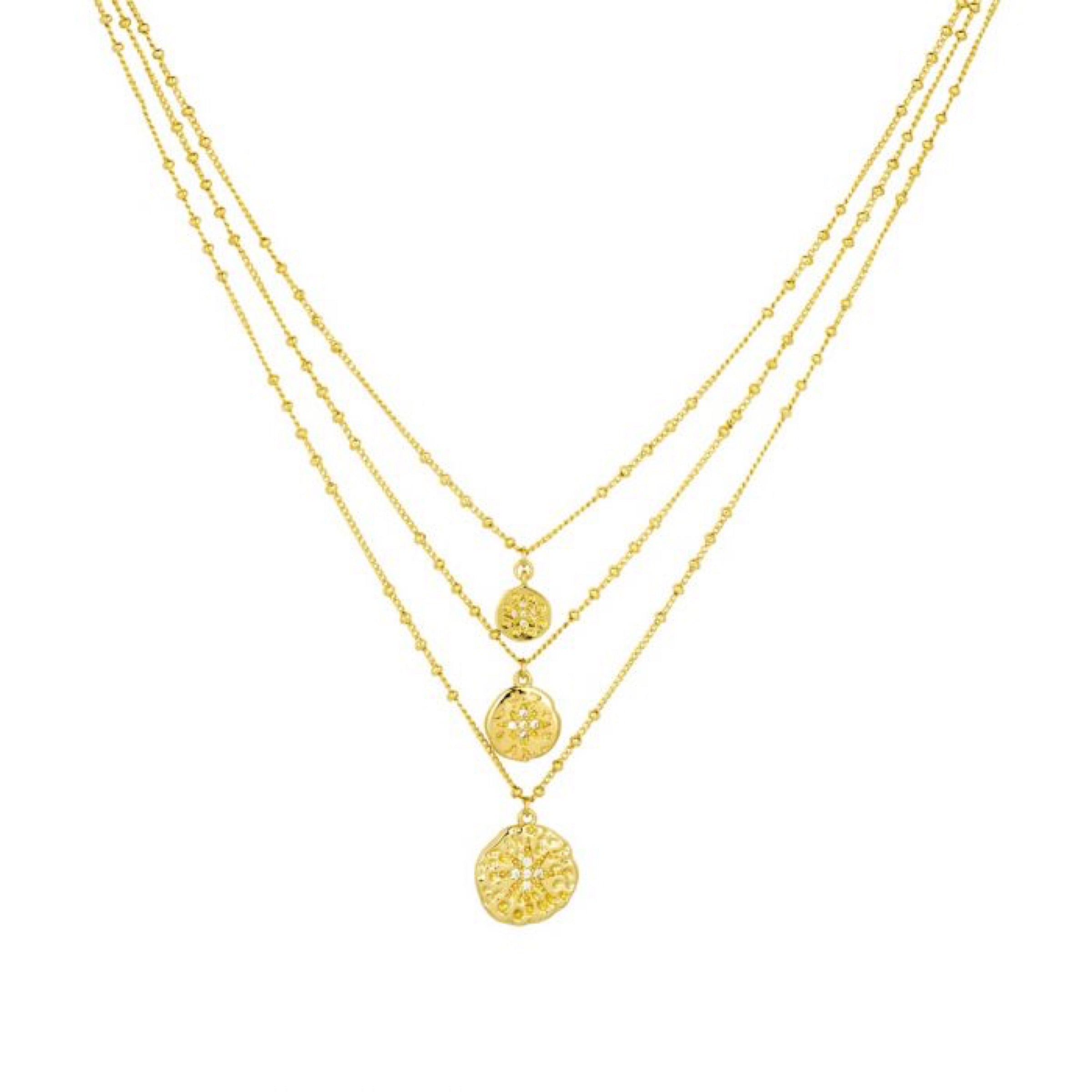 Ash creates luxurious, layered jewellery inspired by strong women and travels around the world. Handmade by artisan makers in 22 carat gold plated on brass this necklace has three strands, each featuring charms encrusted with cubic zirconia.
