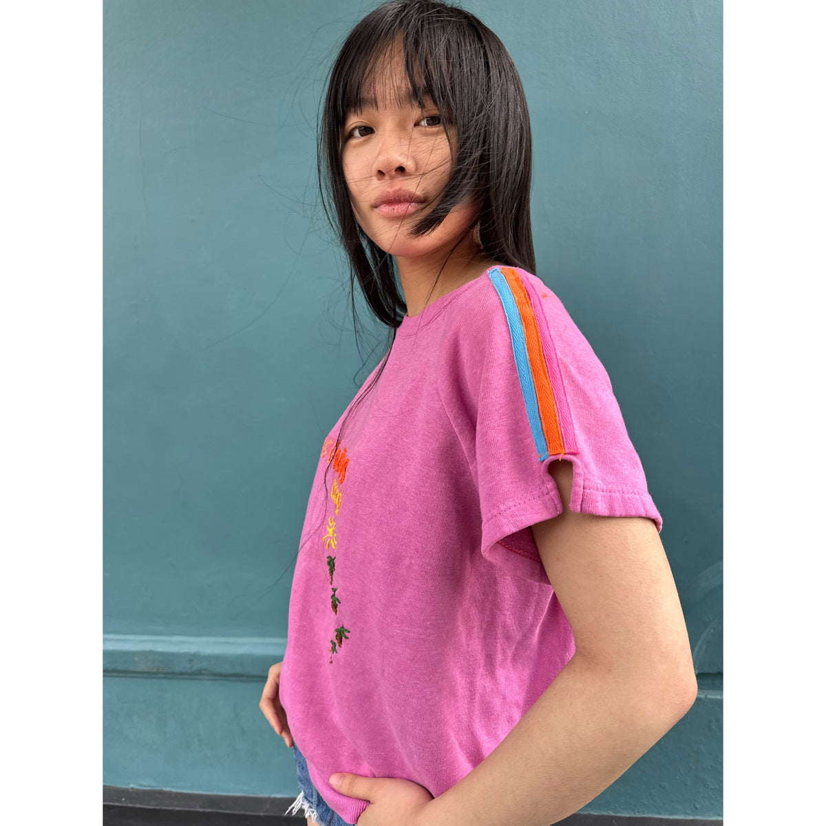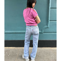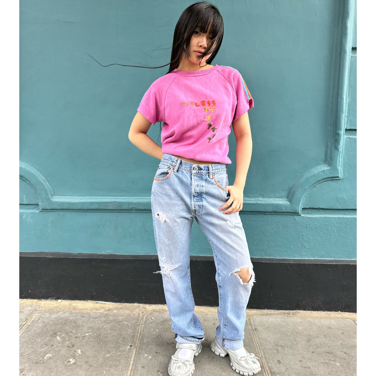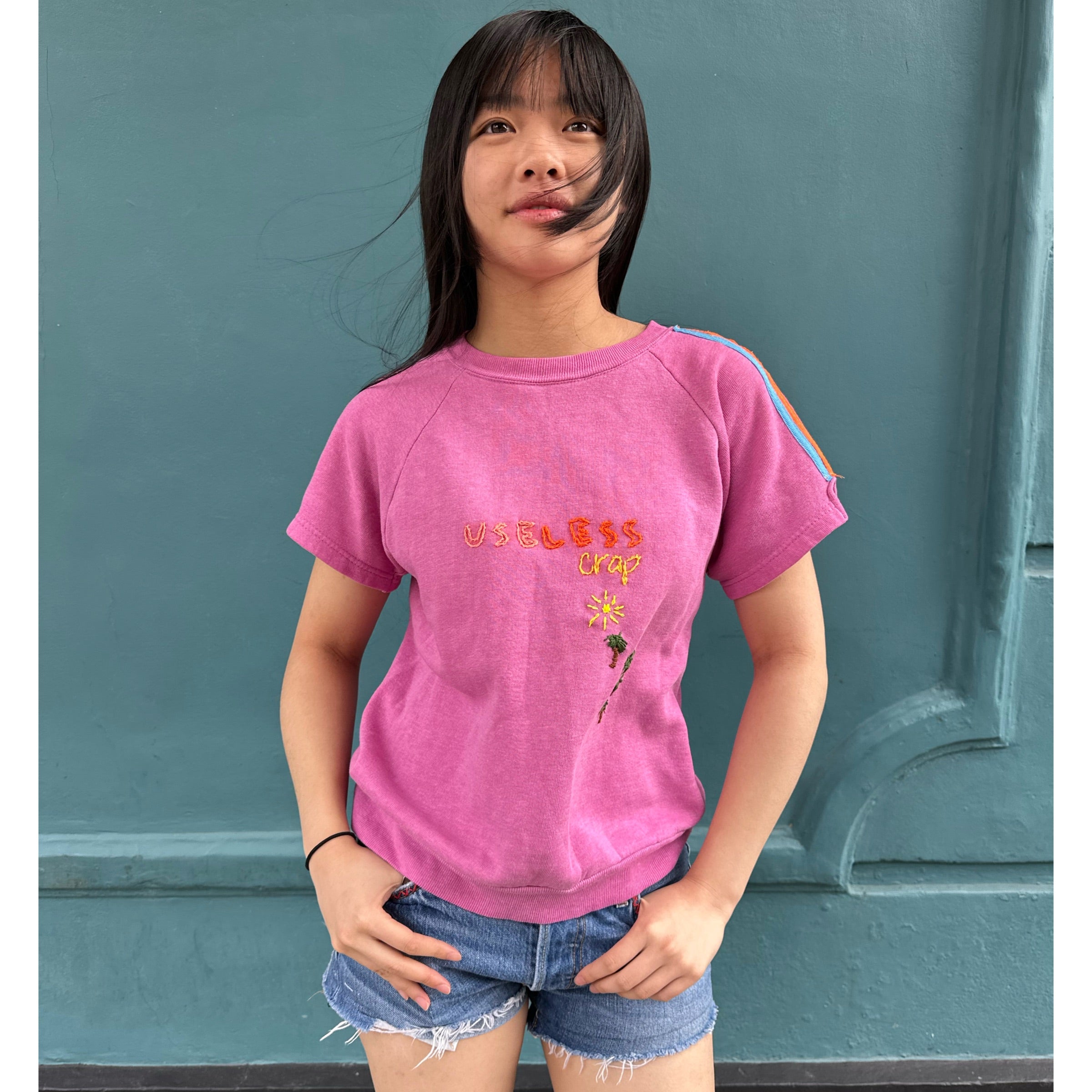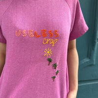This one is a beauty - a vintage faded raspberry-coloured sweatshirt with short sleeves. It features chain-stitched 'Useless Crap' to the front body plus scattered hand embroidery.
