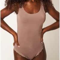 Scoop Back Bodysuit in Taupe with popper fastening, finished with lace trim.