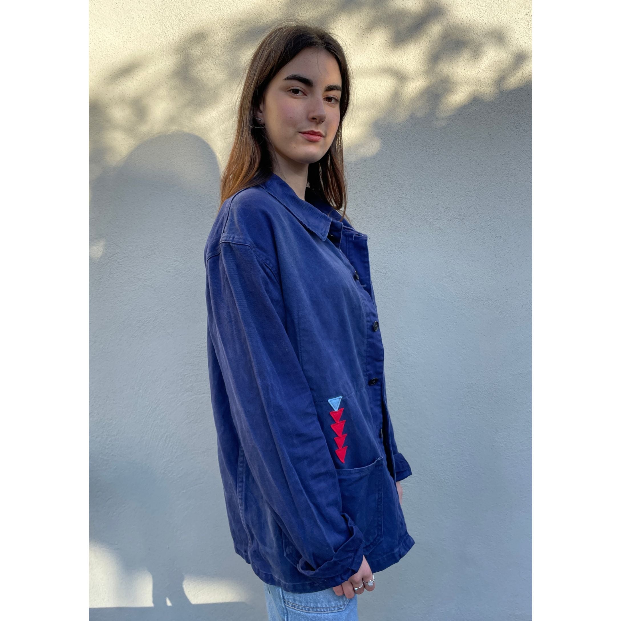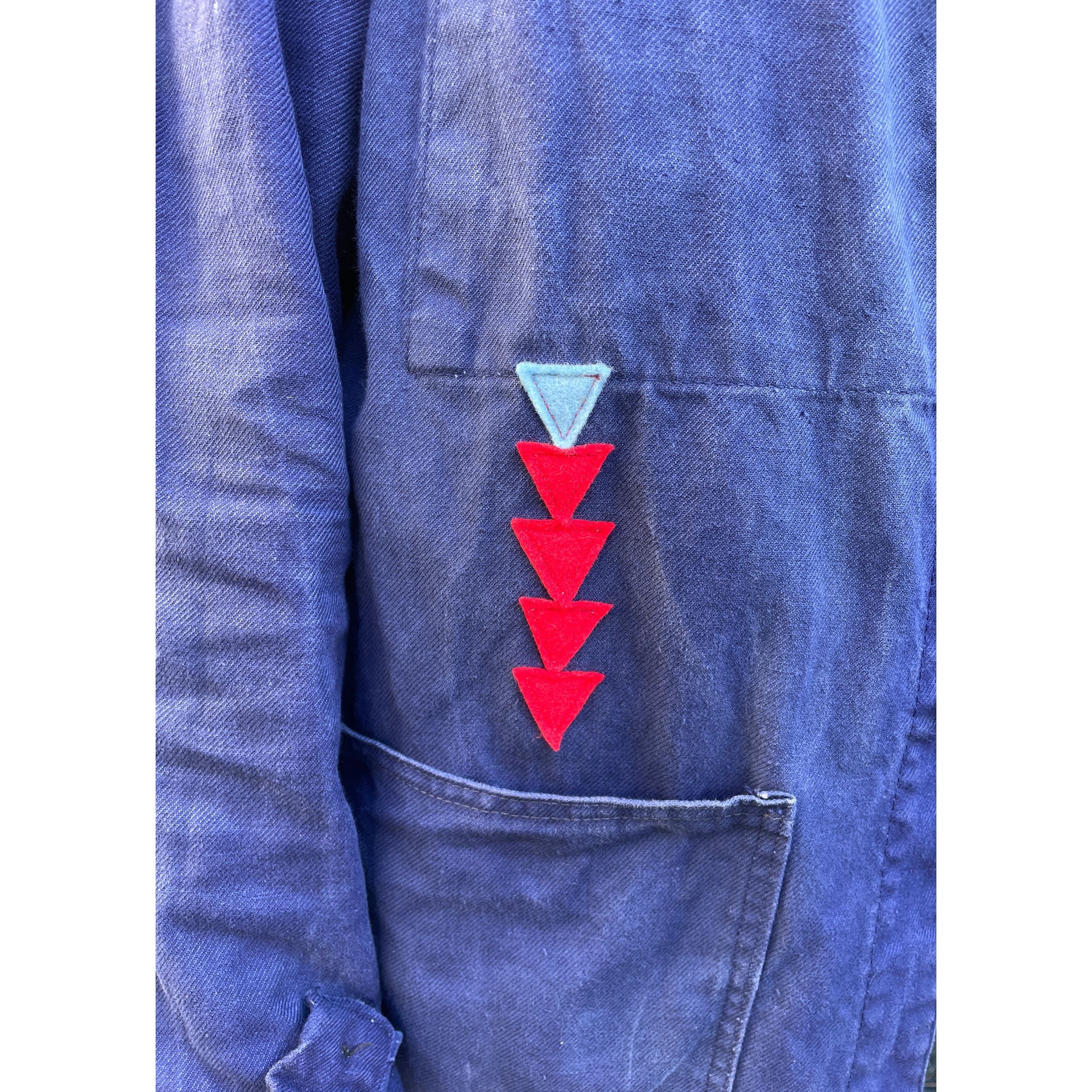 Vintage upcycled chore jacket. We've reworked this piece with vintage patches and our hand appliquéd signature triangles. Great on guys and girls.